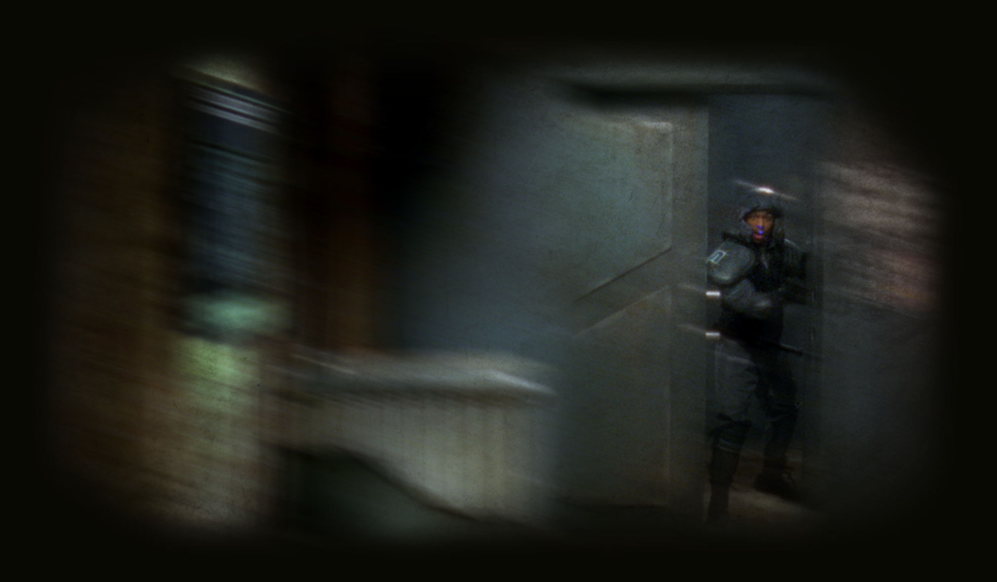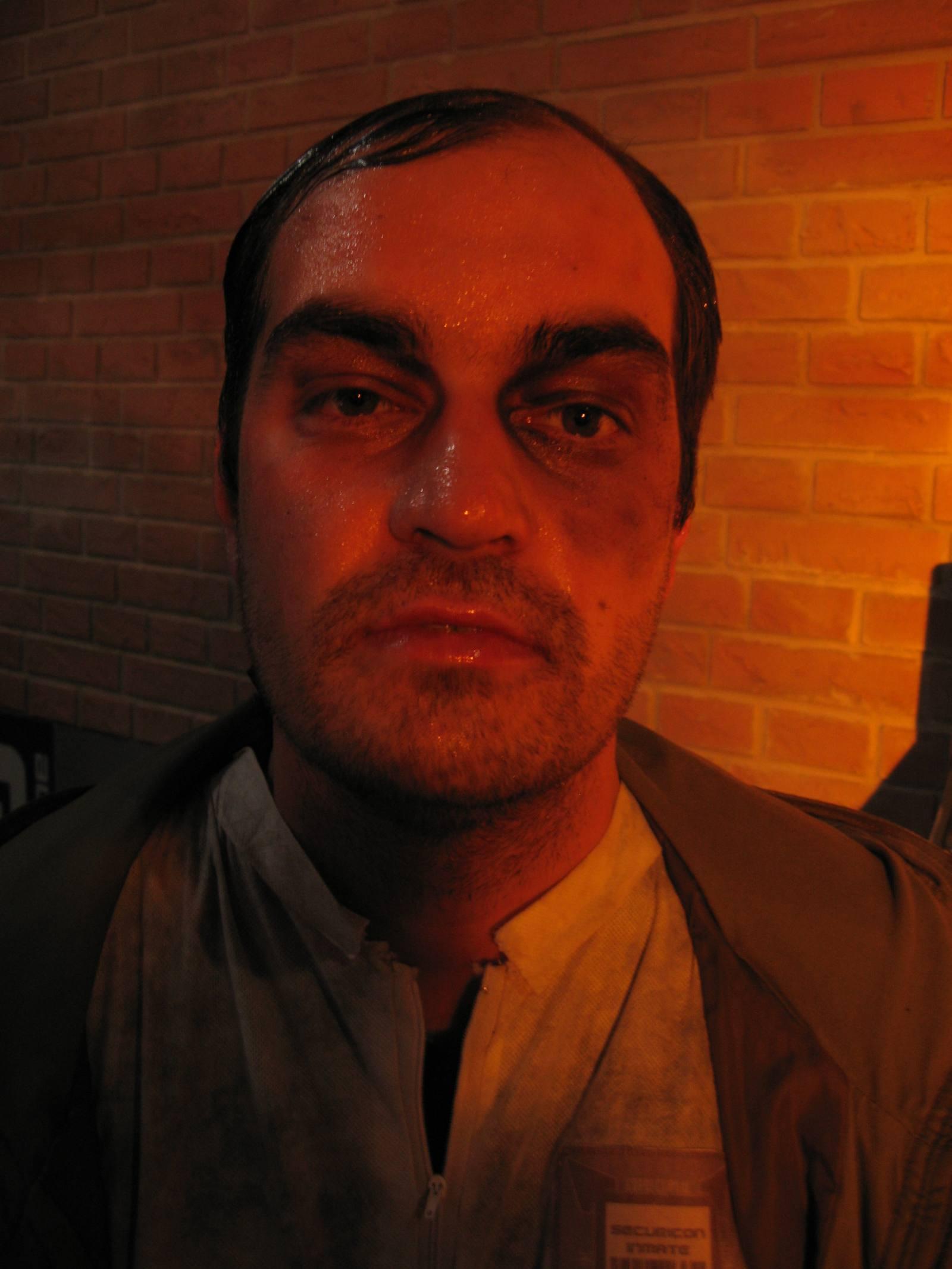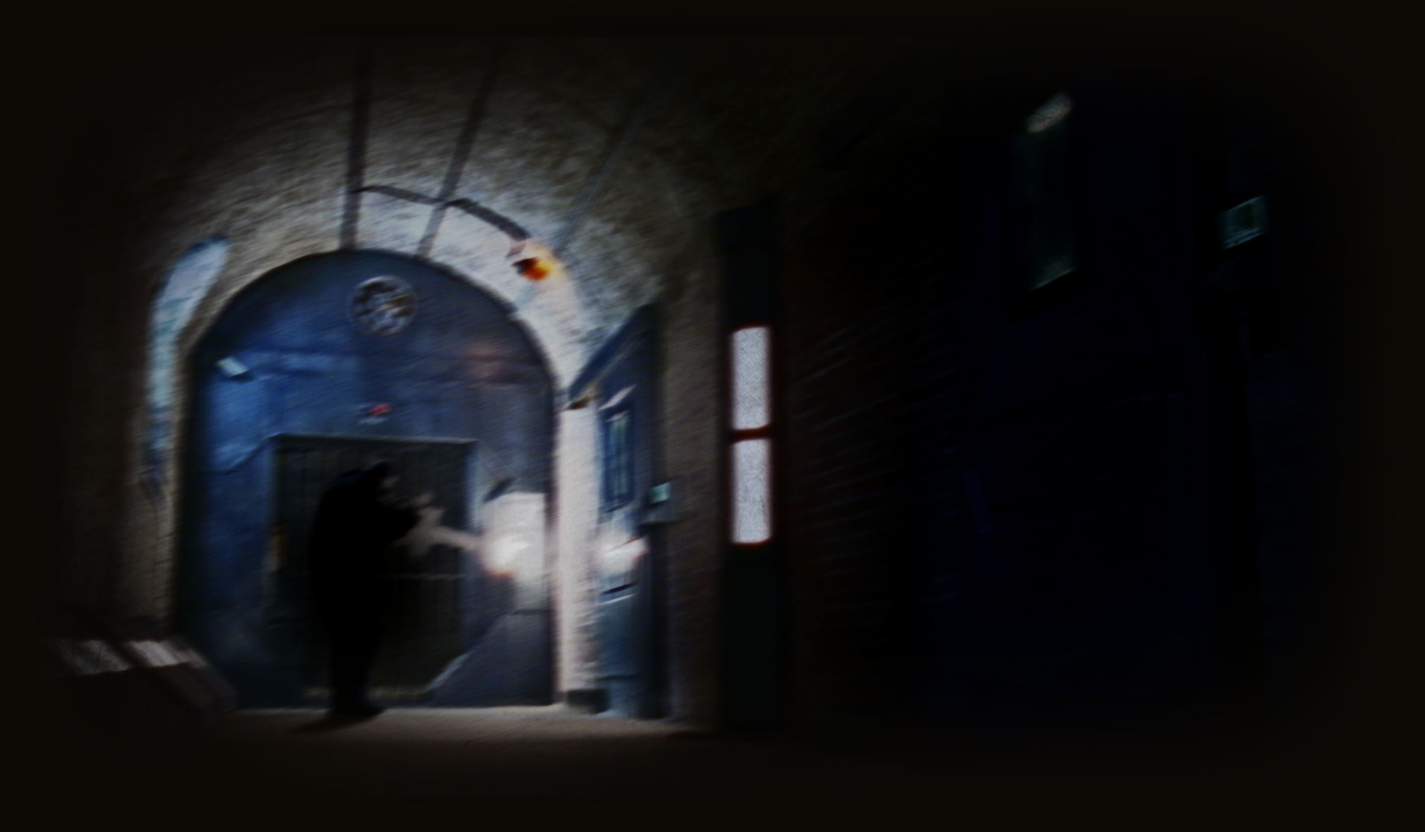Hanno managed to turn the cell set´s door. I need some shots of prisoners inside the cell, behind the door´s window. I use all people available for this: Julian, Ralf, all of them to have as much different footage as possible. Especially Julian is fun to watch, for he goes completely mad, yelling like crazy. I put the rest of the crew in guards costumes, no matter if they fit or not, even the girls are dressed as guards now. After I yell “Action!” all these people start to run around the camera now, crossing the view on the cell door with the inmate looking out. It´s a tight shot. It is supposed to look like people running through the cell block corridor from phase I and it works perfectly. It´s a very funny situation though, looks like we went completely nuts.