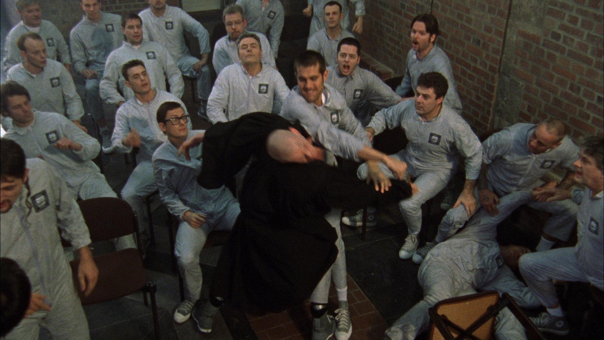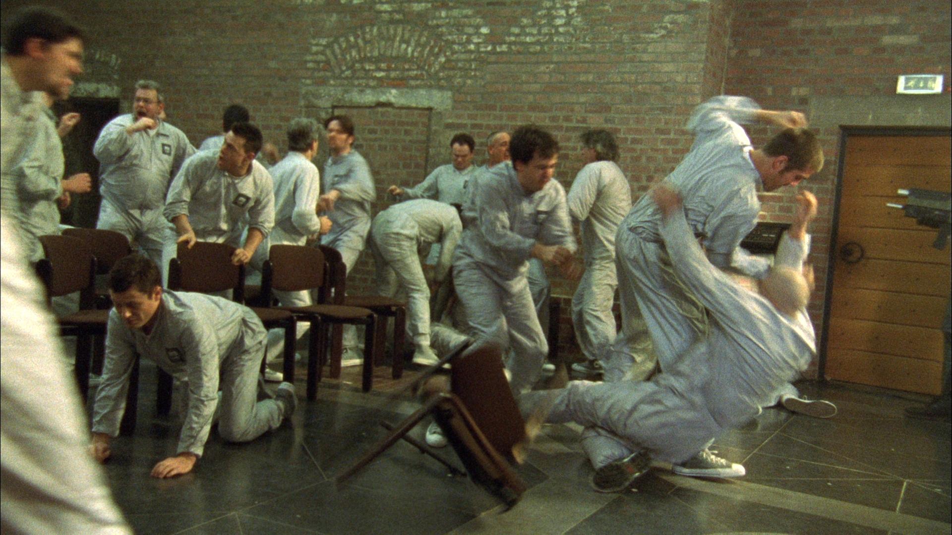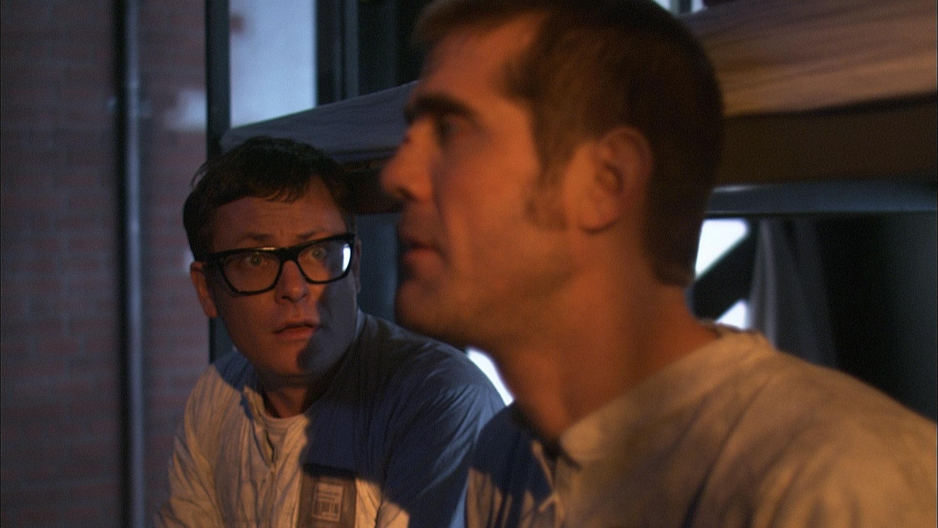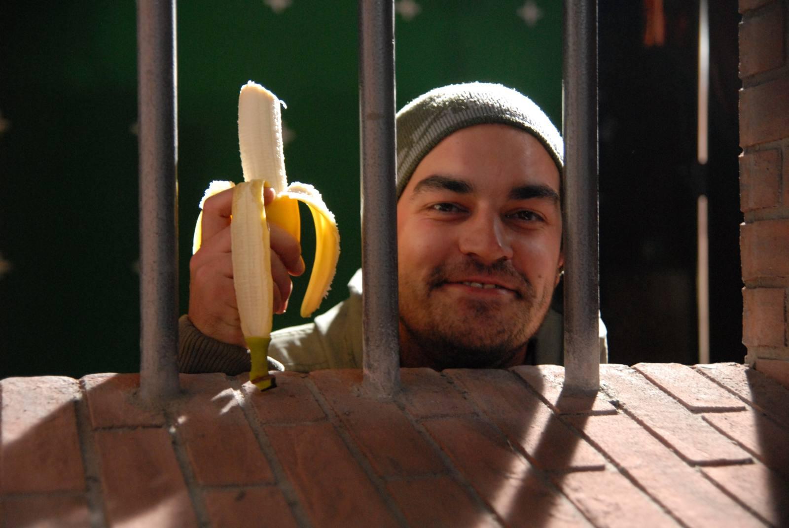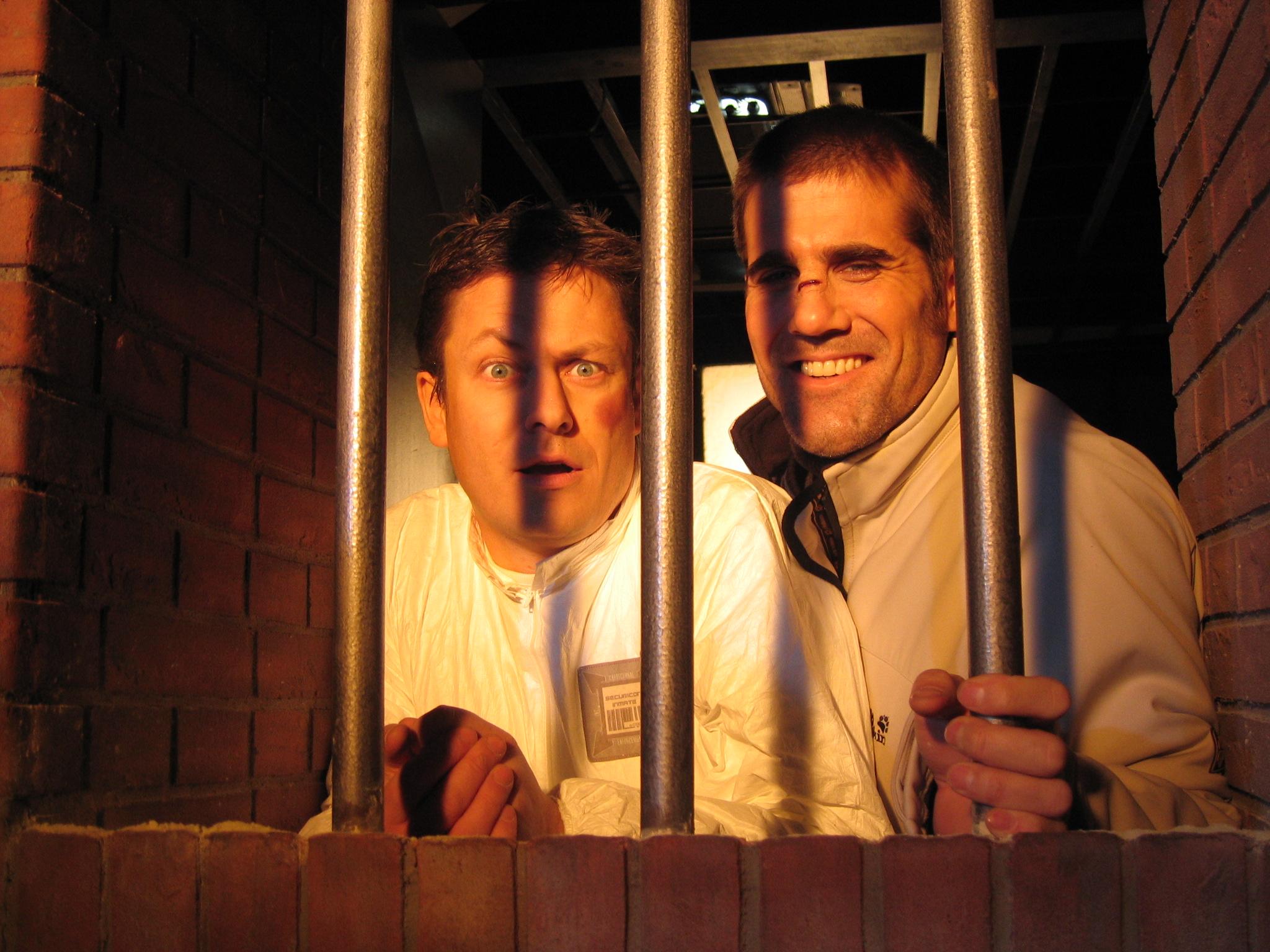 Another scene in the same camera position high above the ceiling of our cell. This time, Steve has to chase Eric again, both of them running around the bunk bed. They are improvising again and Eric has to sing a certain song and playing an air guitar. Constantly, he forgets the song´s correct text and we all start laughing again. As Steve awkwardly climbs over the bunk bed, in pursuit of Eric loosing the words again, all control is lost and Eric and Steve can´t stop laughing anymore, joined by the whole team. It´s too funny.