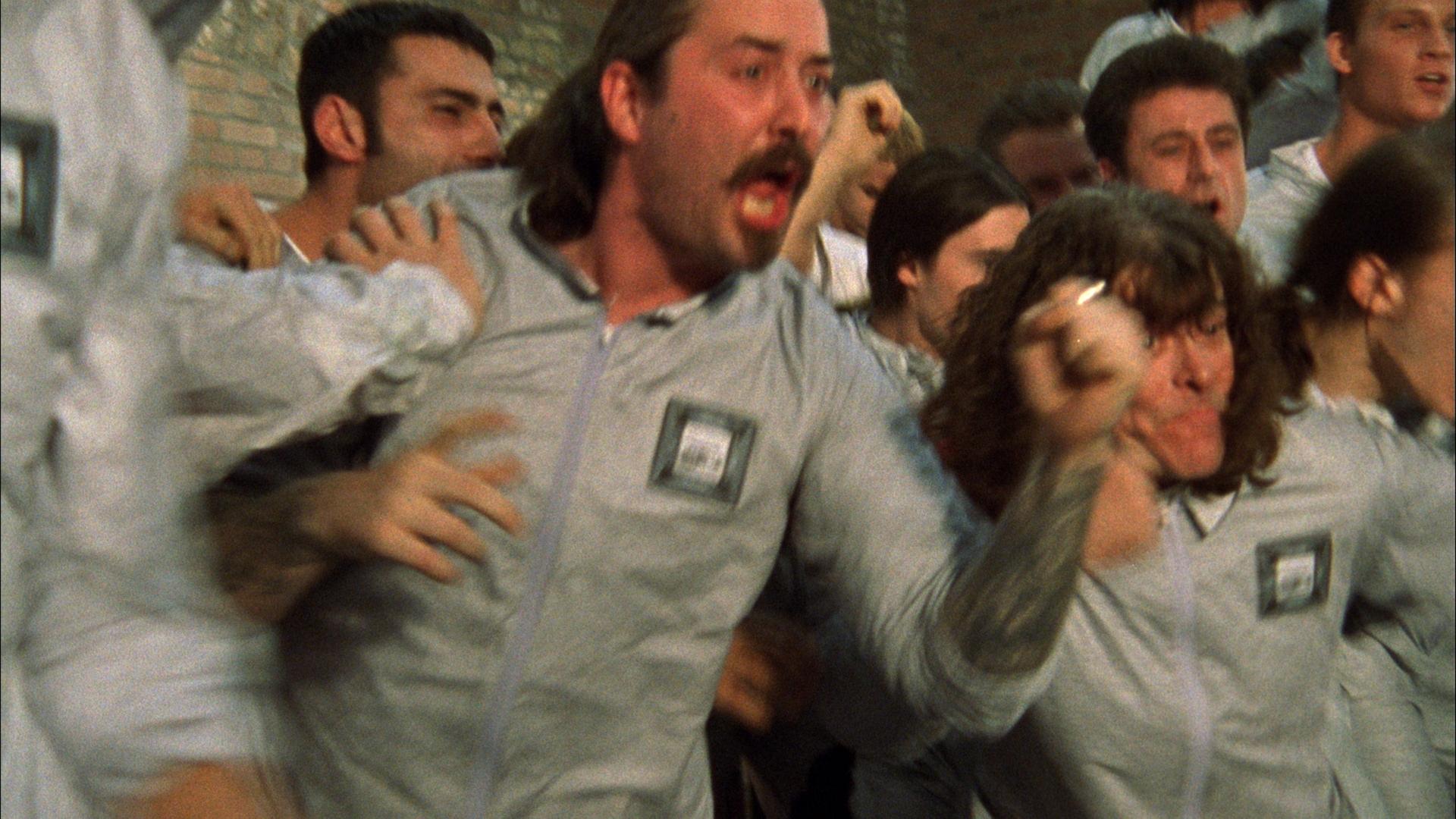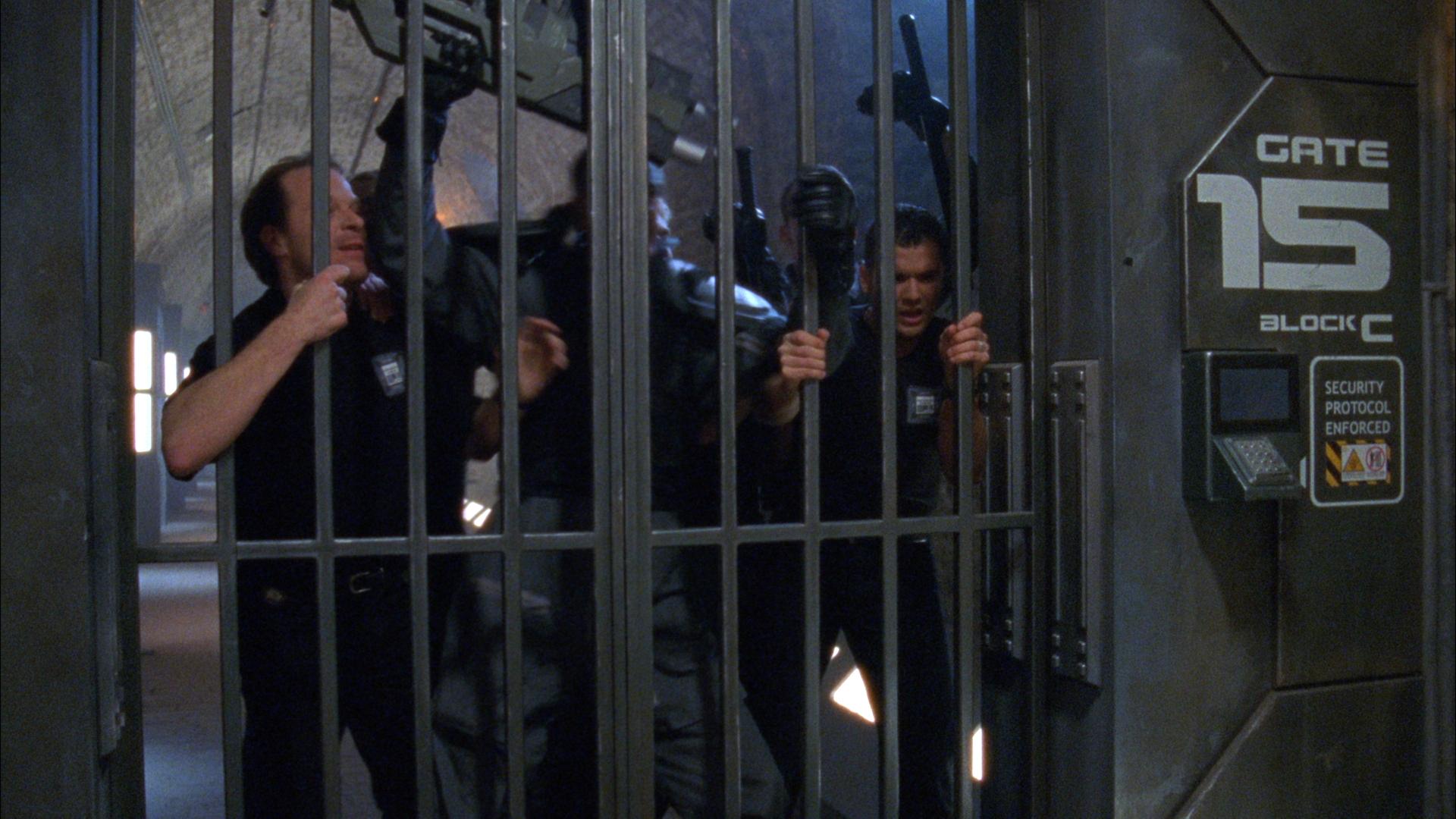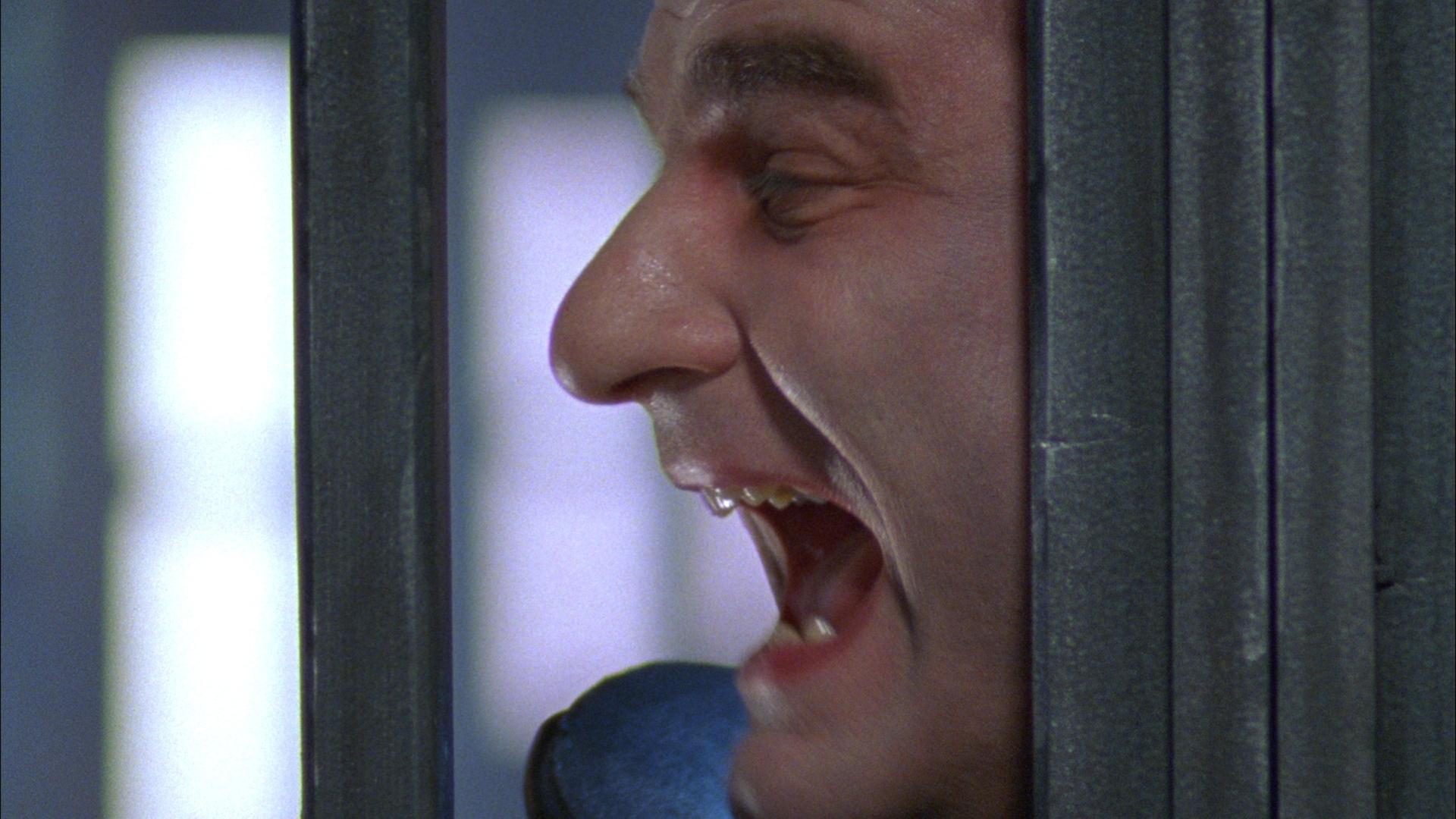 The next setup is from the same camera angle again. Steve´s on the upper bunk bed, pulling at the cell´s steel grid ceiling, made of painted wood, of course. Wood is such a great material to work with, but when it´s painted to resemble steel, it´s still wood. So Steve, like so many times before, finds himself in a situation where he is supposed to pull madly at the bars, but can´t, cause they would give away the fact they aren´t made of steel. A dilemma, but somehow, being a good actor, he manages to make it believeable.