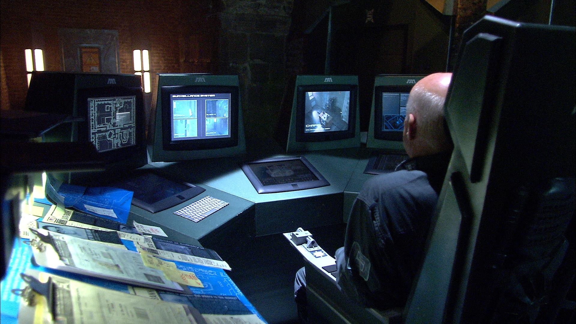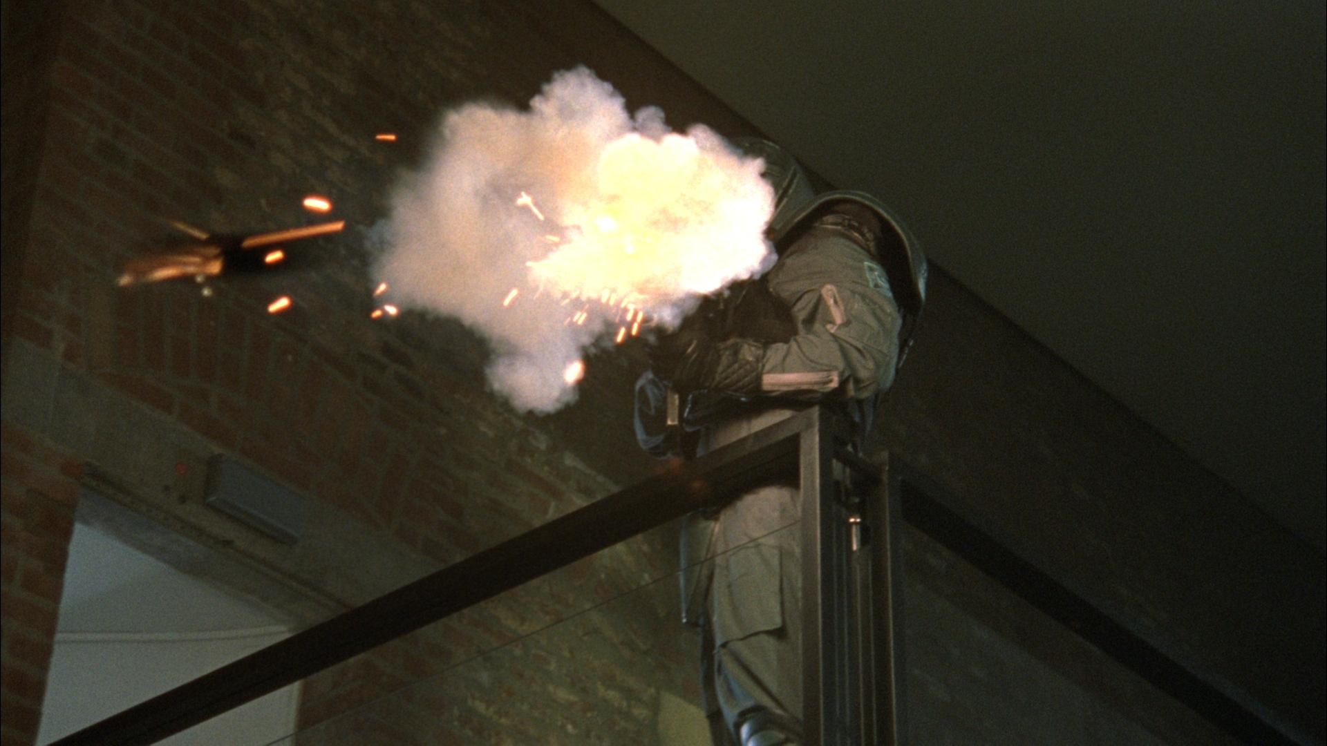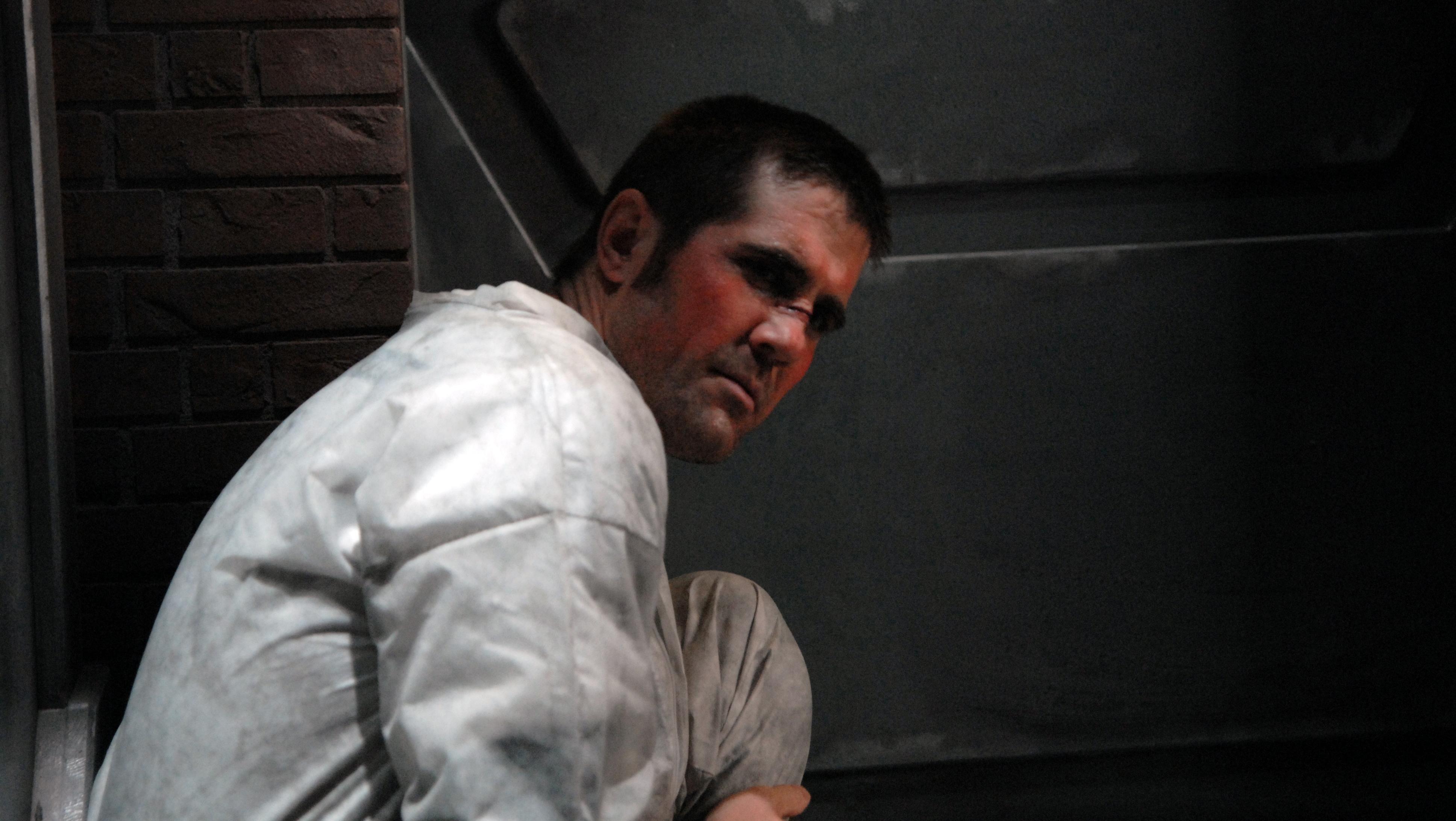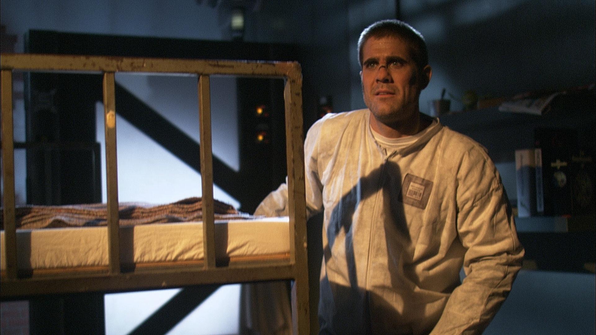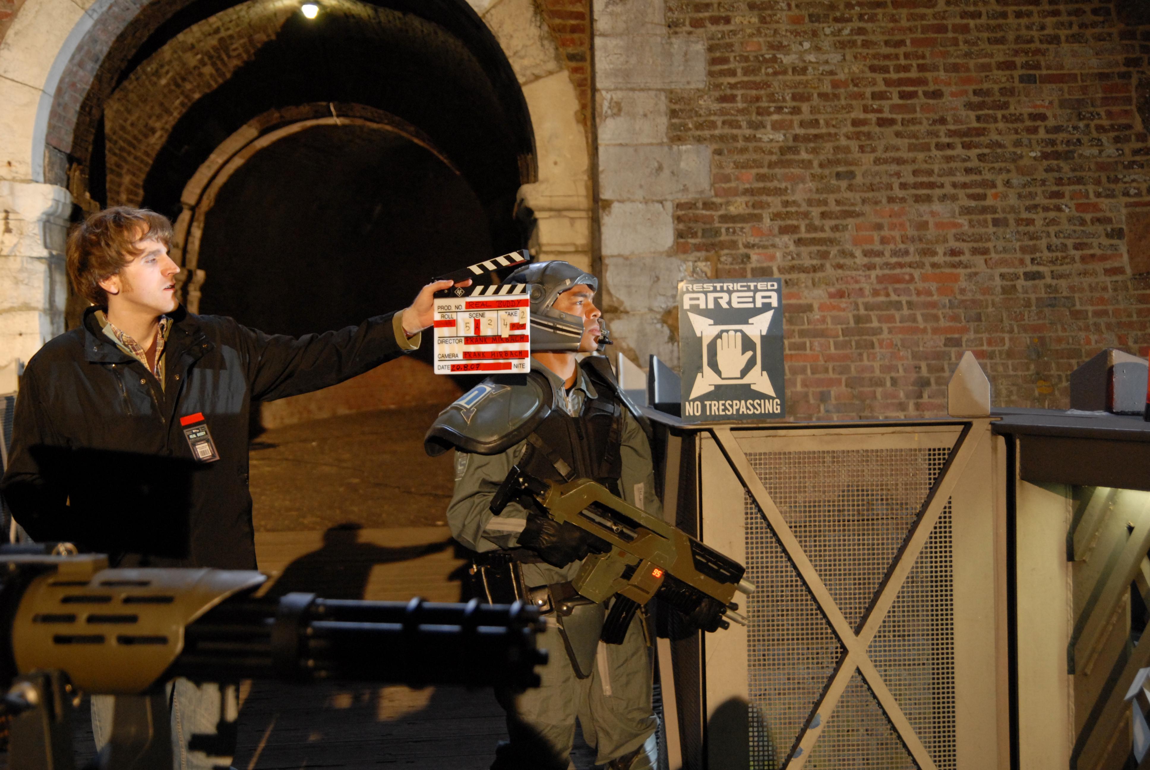 We did two more explosions, all from different angles. We´re almost done for this night. What follows, is basically a repetition of the shot before. Everything is set up again, another camera position is prepared, this time inside the cell, from a low angle on Steve Hudson. Bang ! Steve is blown away again ! He lands safely on the mat, catched by a production assistant. Again playback to check the shot. Done !