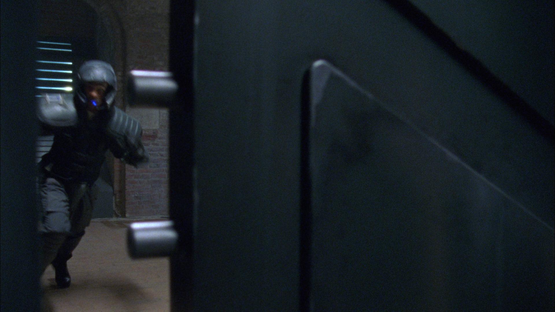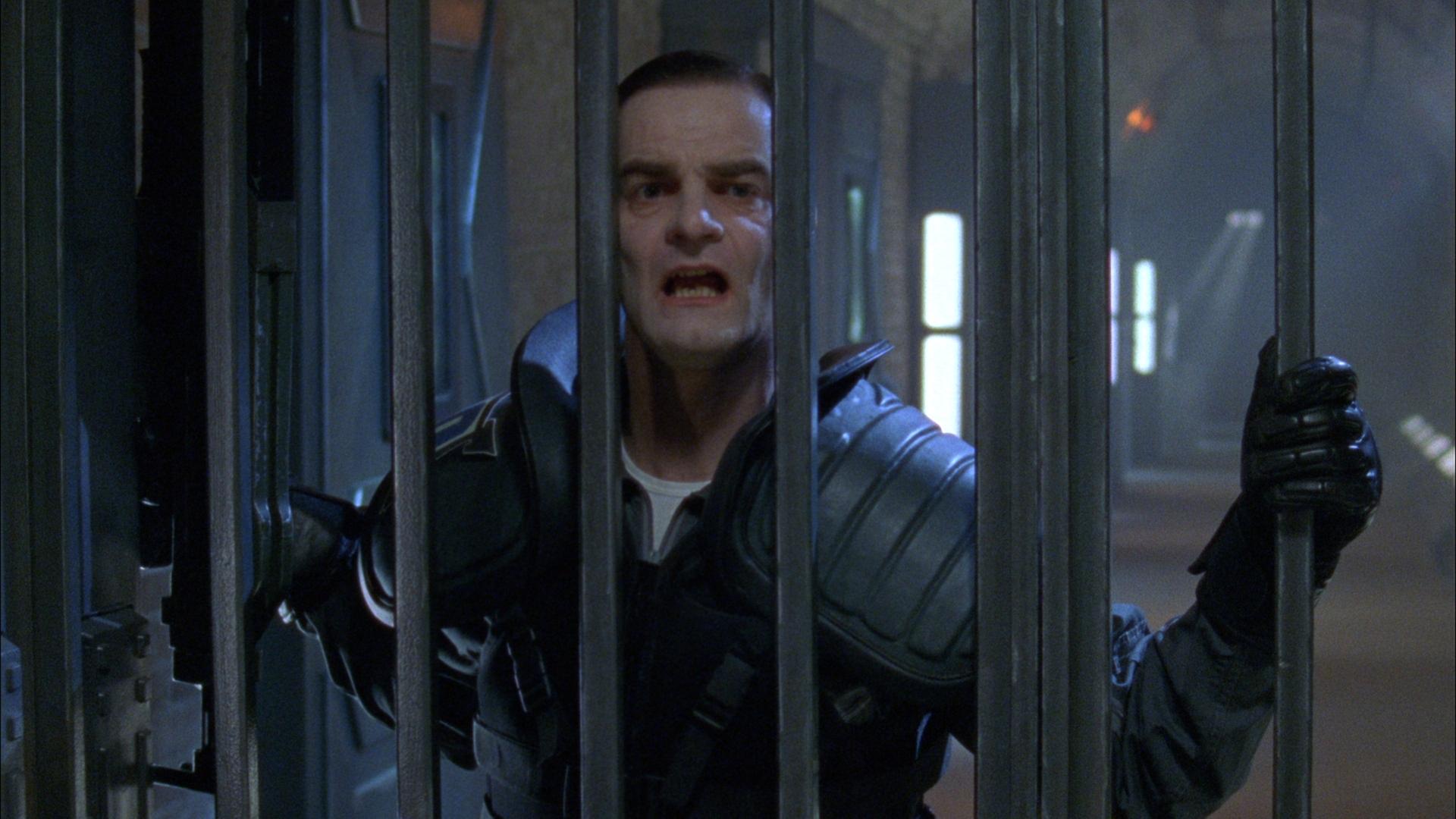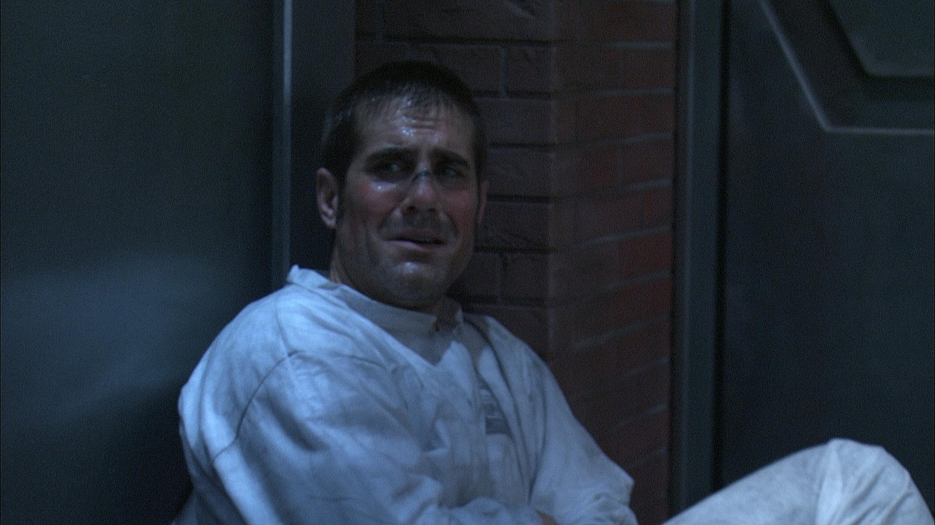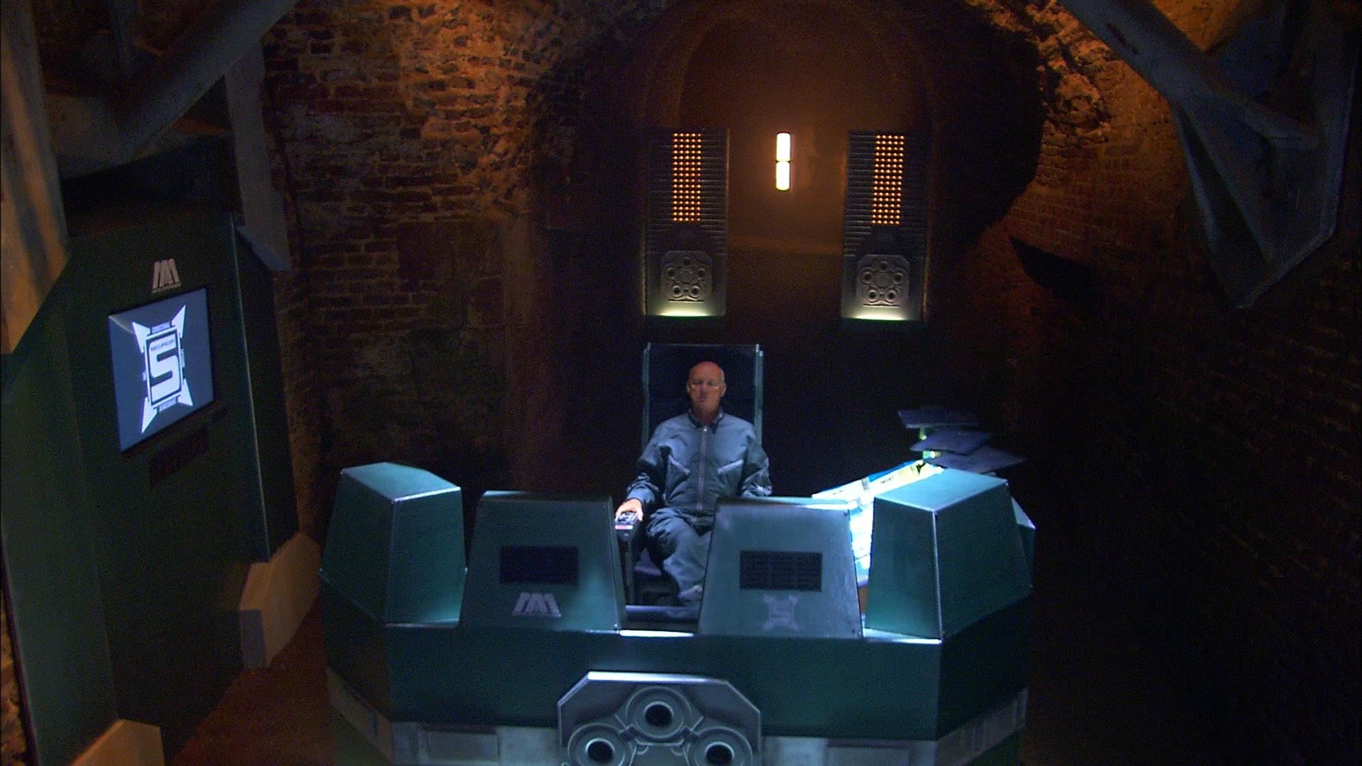 We did two more explosions, all from different angles. We´re almost done for this night. What follows, is basically a repetition of the shot before. Everything is set up again, another camera position is prepared, this time inside the cell, from a low angle on Steve Hudson. Bang ! Steve is blown away again ! He lands safely on the mat, catched by a production assistant. Again playback to check the shot. Done !