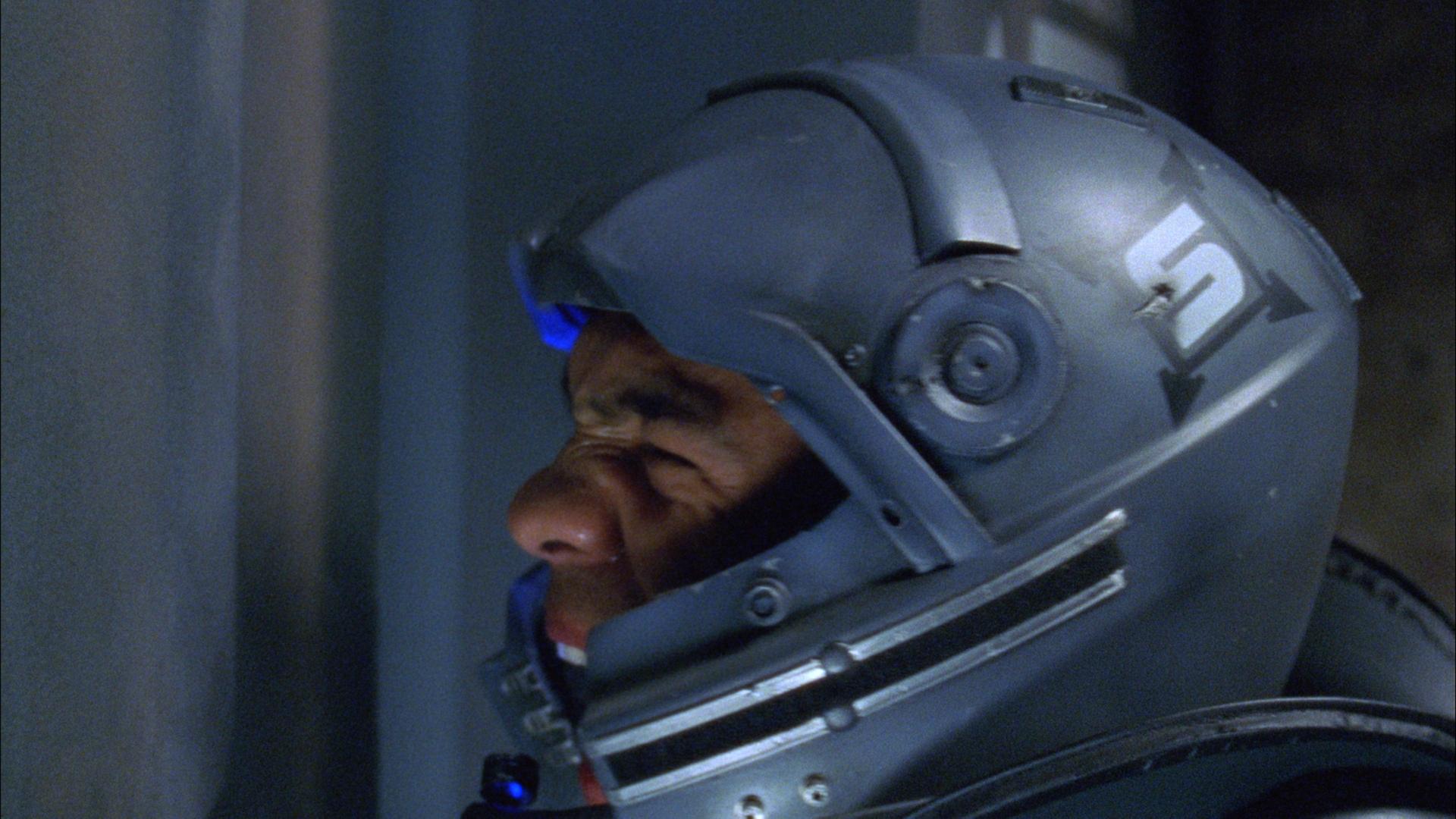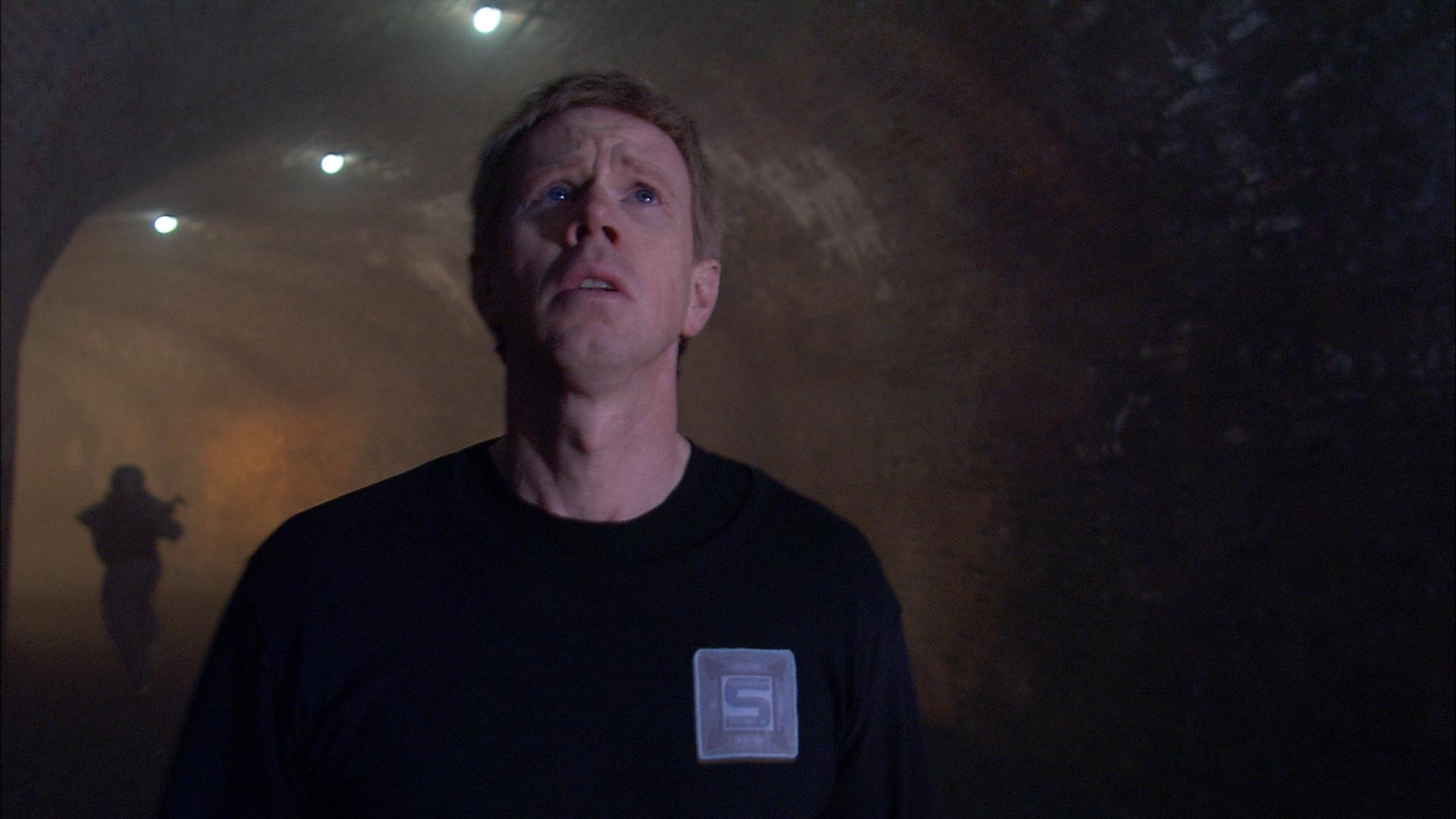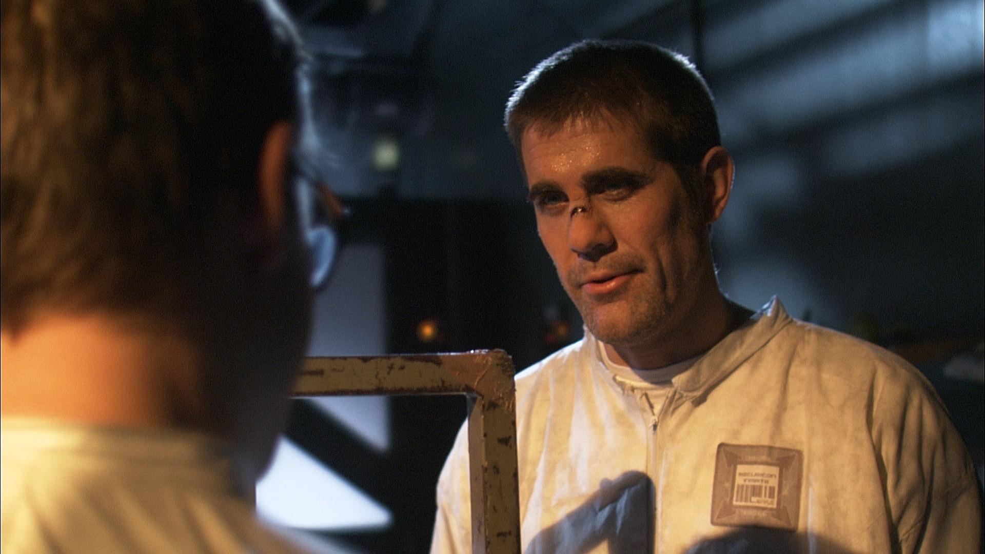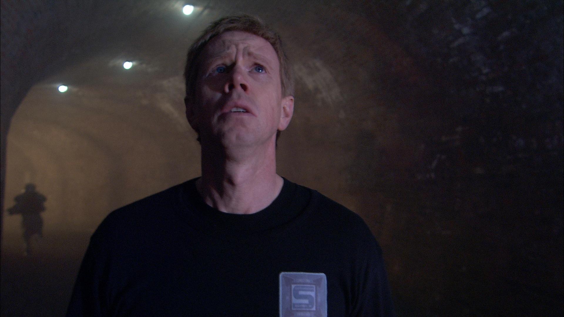 We did two more explosions, all from different angles. We´re almost done for this night. What follows, is basically a repetition of the shot before. Everything is set up again, another camera position is prepared, this time inside the cell, from a low angle on Steve Hudson. Bang ! Steve is blown away again ! He lands safely on the mat, catched by a production assistant. Again playback to check the shot. Done !