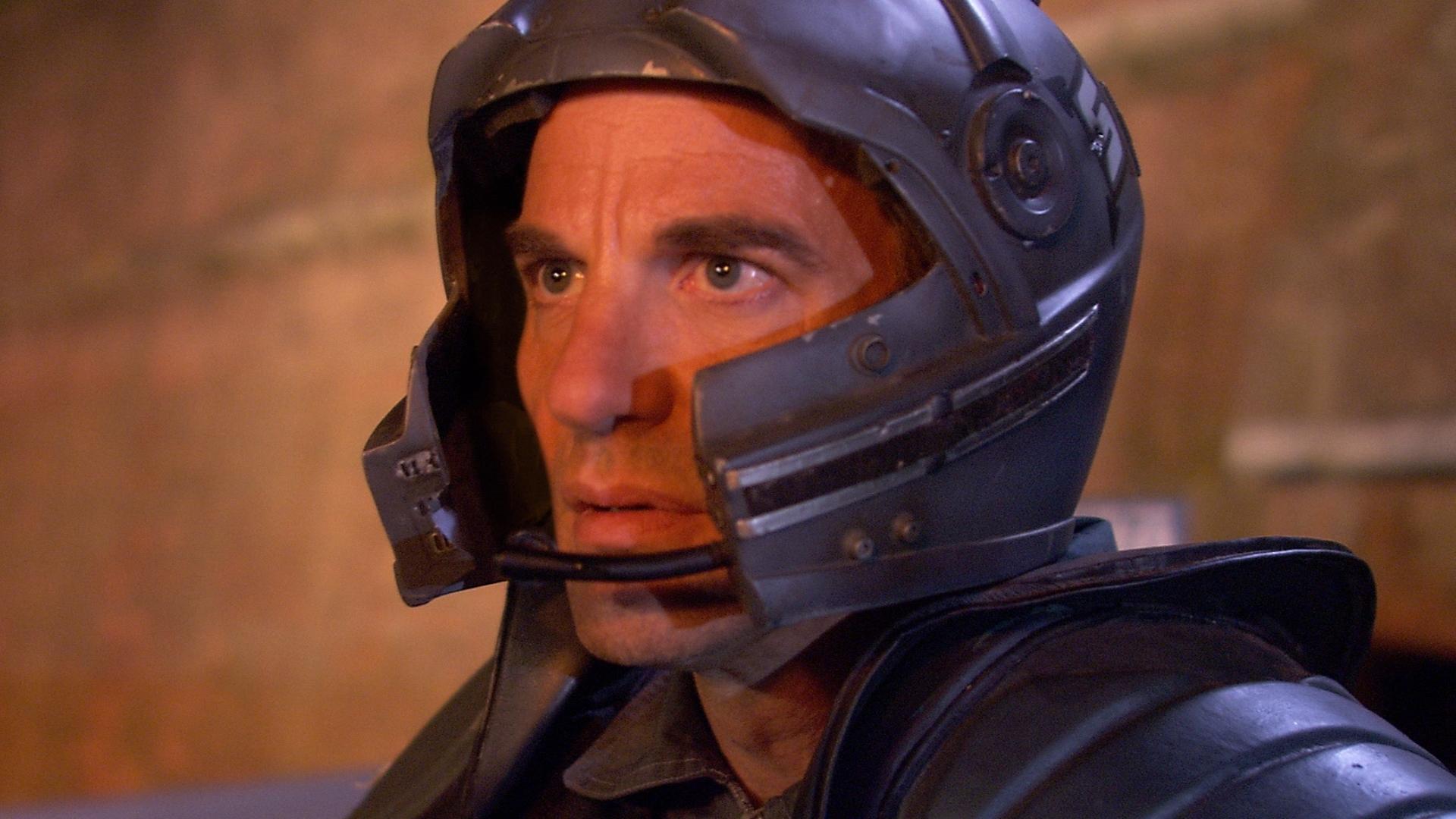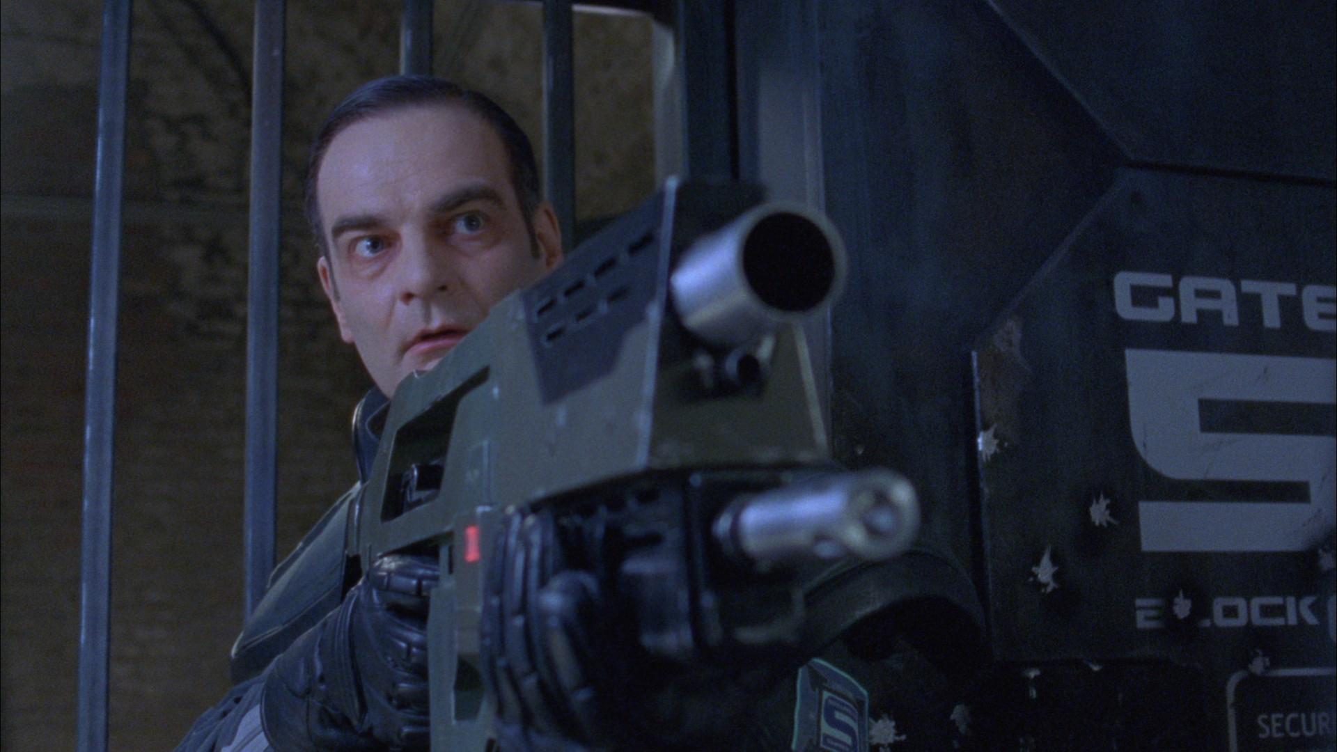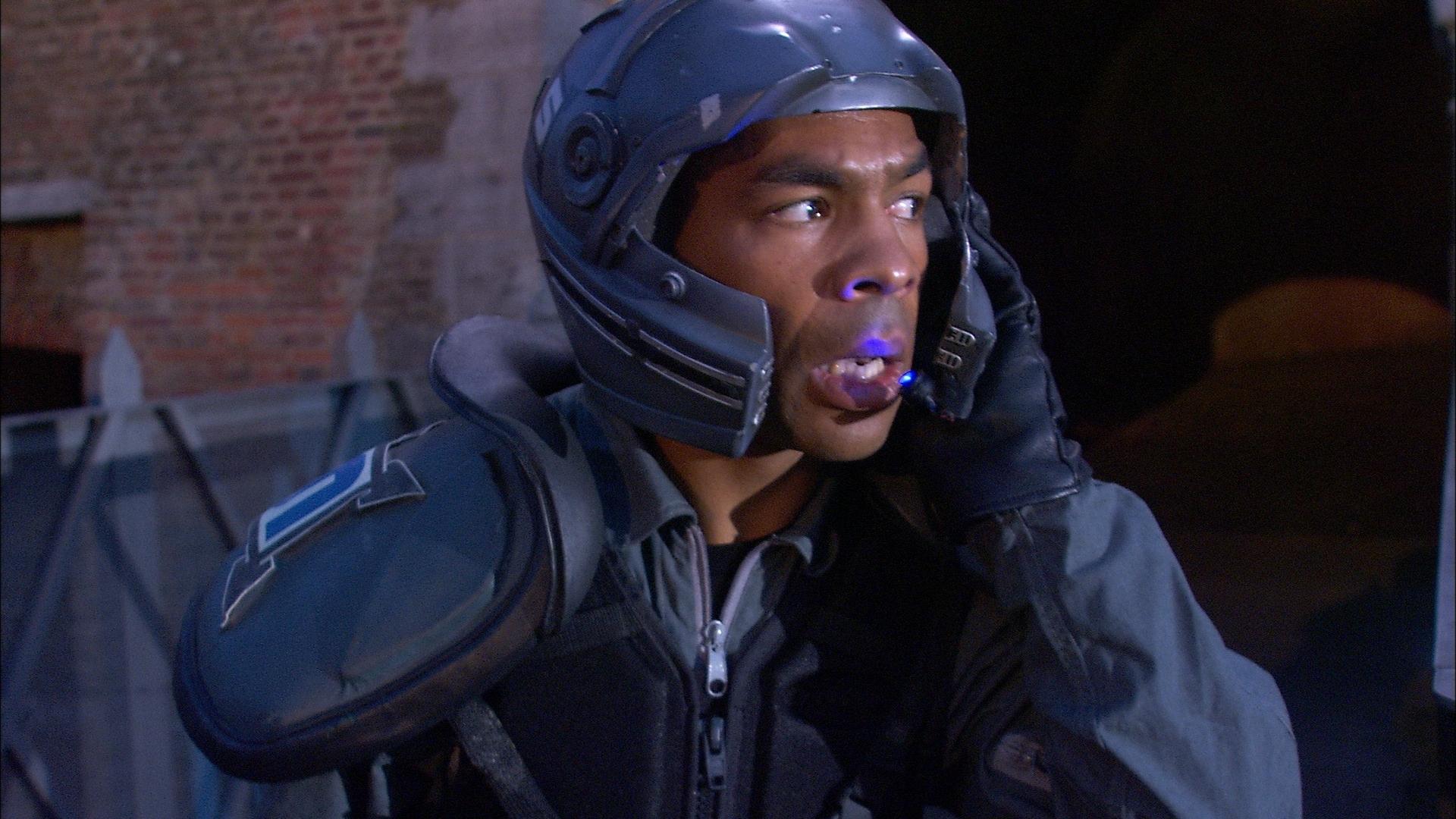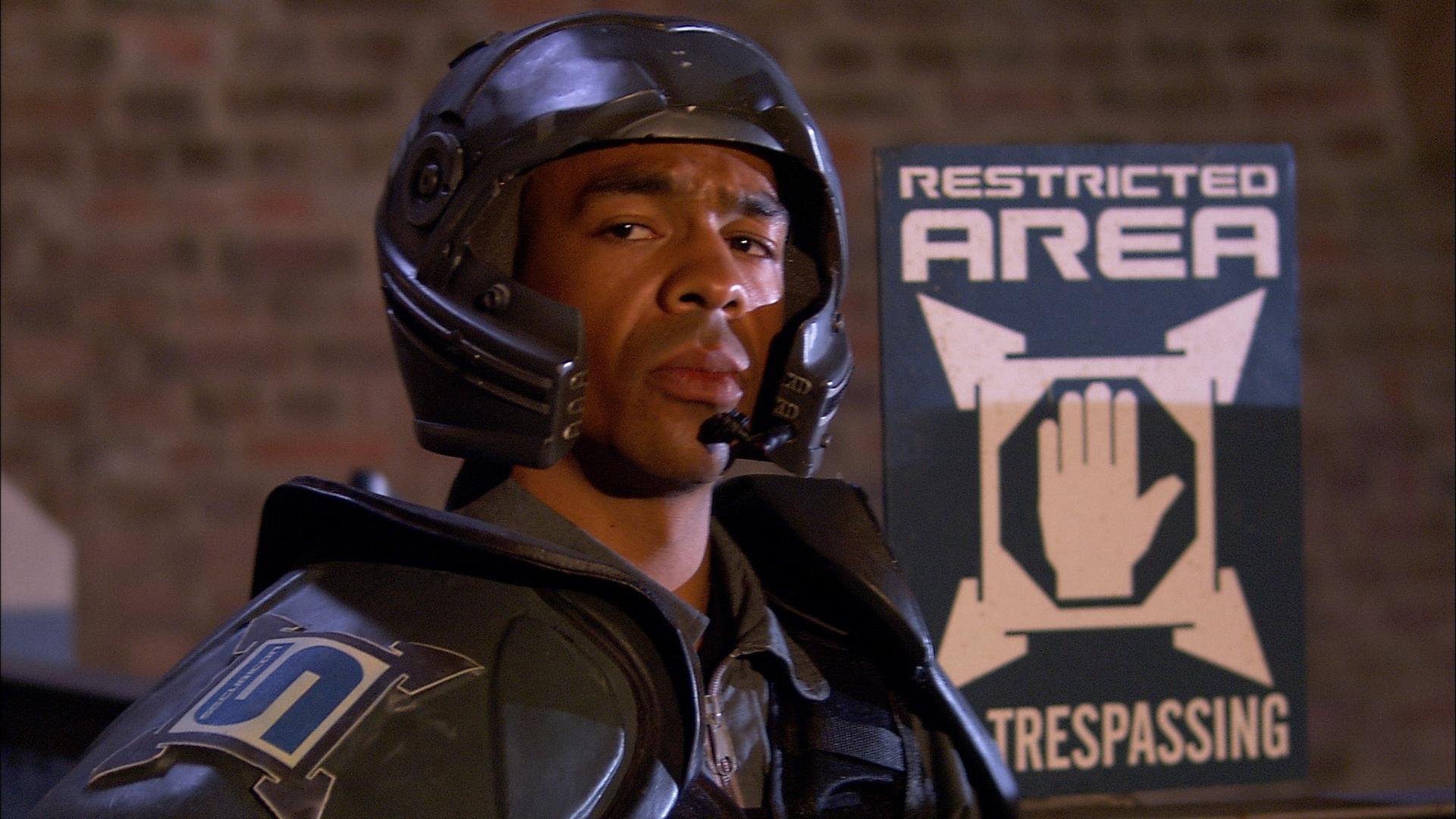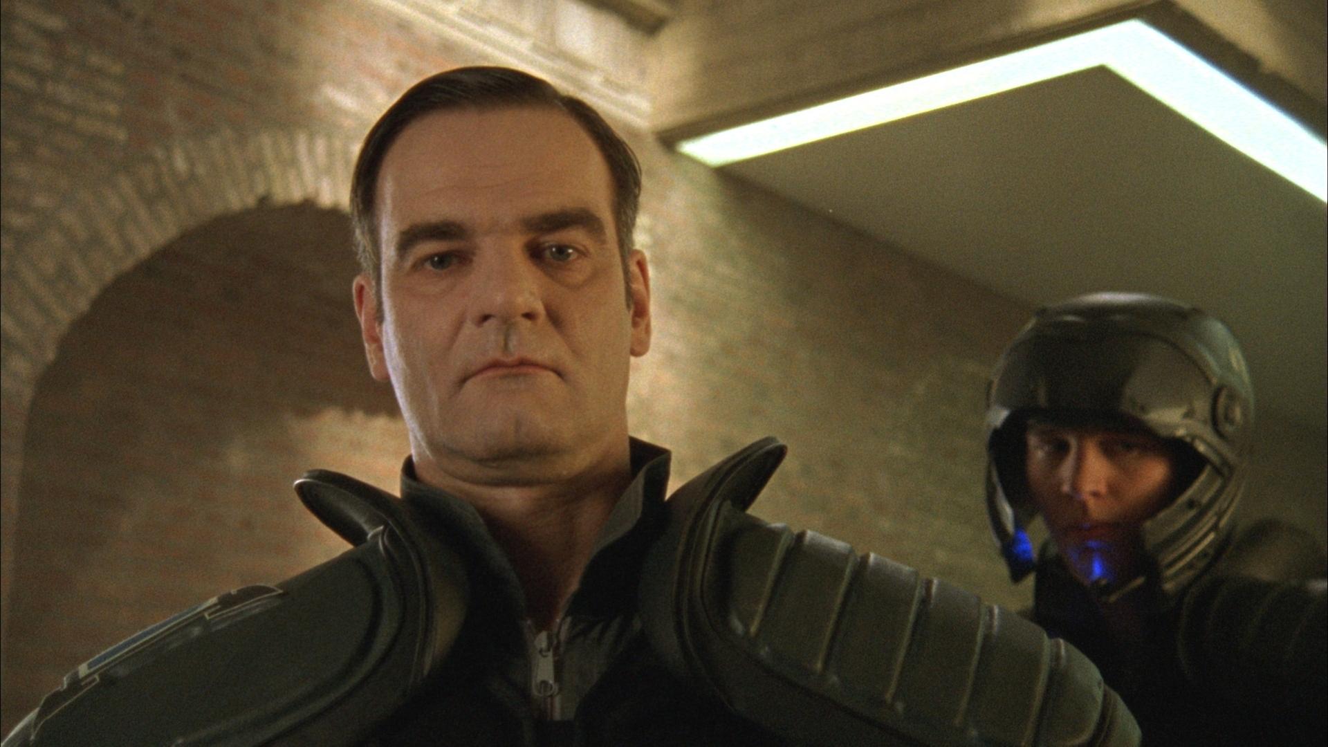 We did two more explosions, all from different angles. We´re almost done for this night. What follows, is basically a repetition of the shot before. Everything is set up again, another camera position is prepared, this time inside the cell, from a low angle on Steve Hudson. Bang ! Steve is blown away again ! He lands safely on the mat, catched by a production assistant. Again playback to check the shot. Done !