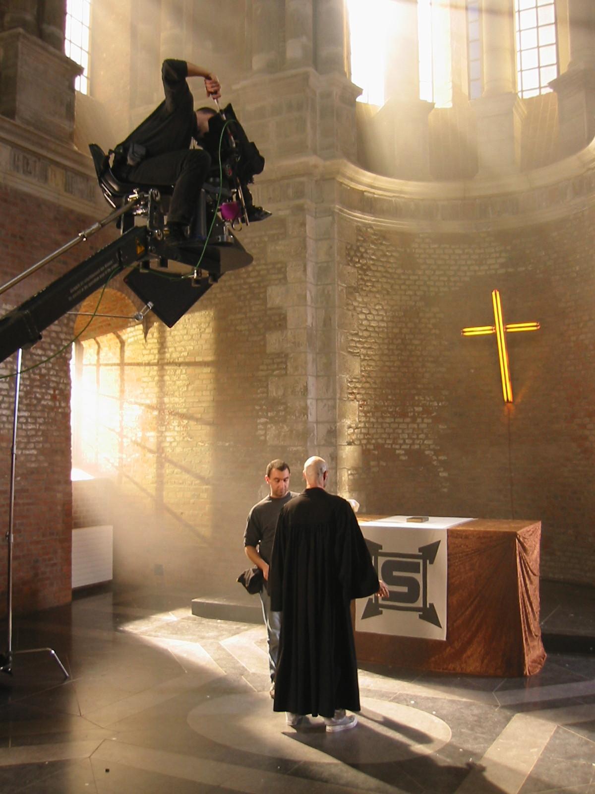 Back in the hall, after a good days sleep. I decided to to some missing shots today, only minor things we have left over from phase I. I only got a limited crew, Hanno Gerken, Anne Schille, Chris Weidner, Jens Fischer, Julian Eilmann, Ralf Burmester, Jens Tervooren, the works. But it´ll do. We start with doing shots left over from the chapel scene. Hanno fills in for Mad Vic, played by Andreas Stoeck. Due to the fact we haven´t got the original black robes from that scene, a piece of black cloth will do. It´s a close up of hands pouring wine for Mad Vic´s mass.