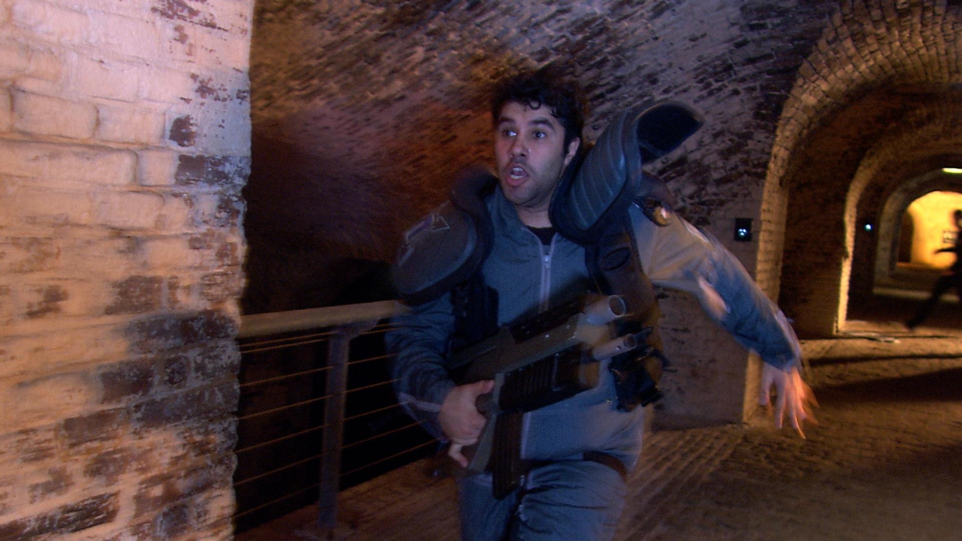 Time for the last setup. It´s just Hanno and me now. The weapon´s compartment has to be shot. As we open the compartment, we see that the LED indicator on the guardrifle isn´t working anymore. The batterie´s empty. Ralf never showed us how to open the thing. Damn. We start shooting without it, but I realize this is not working. Fortunately, after switching the electronics off for 15 minutes, the LED indicator is back on. Quickly, we shoot Didi Hollinderbäumer´s POV into the compartment.