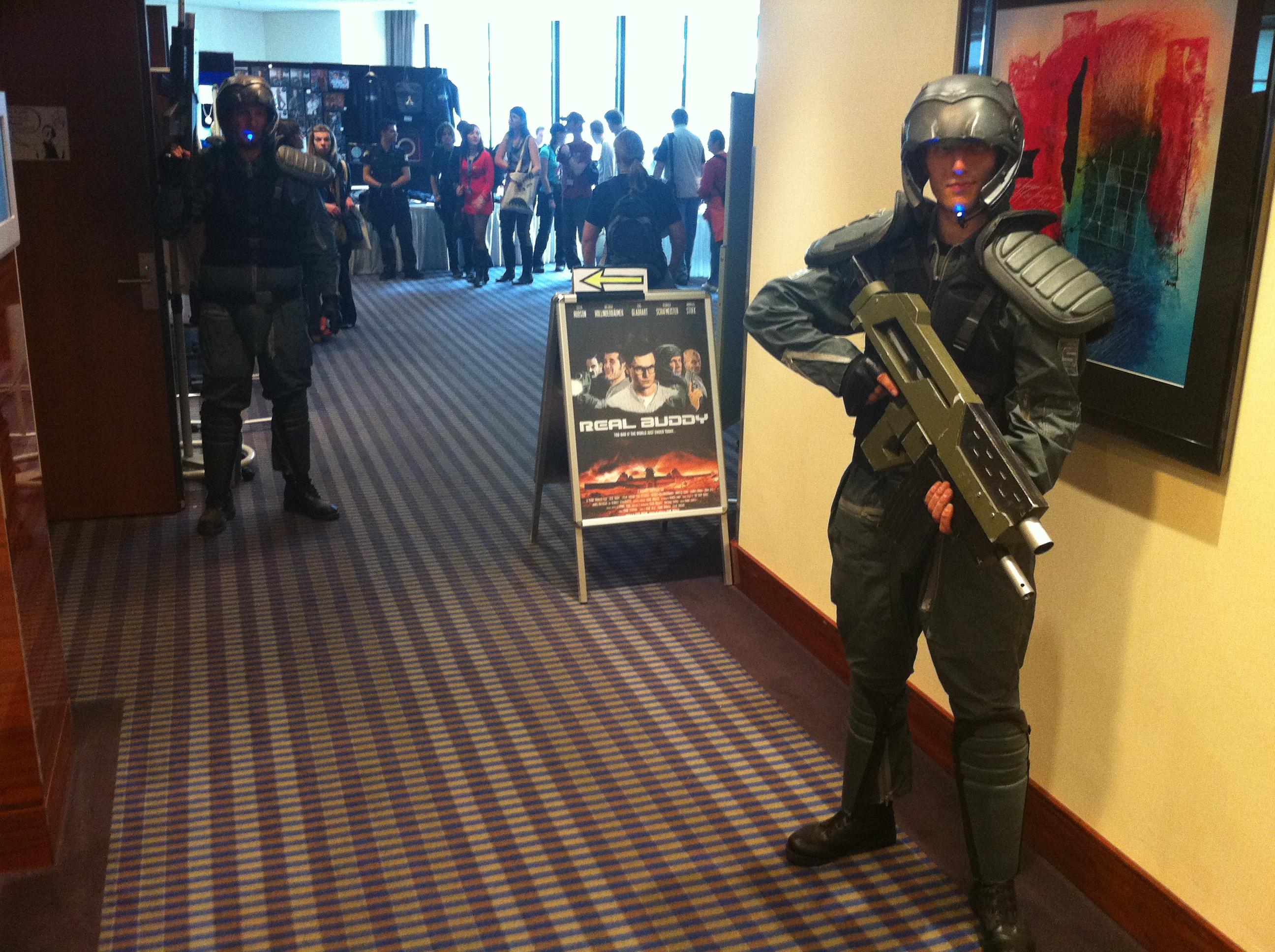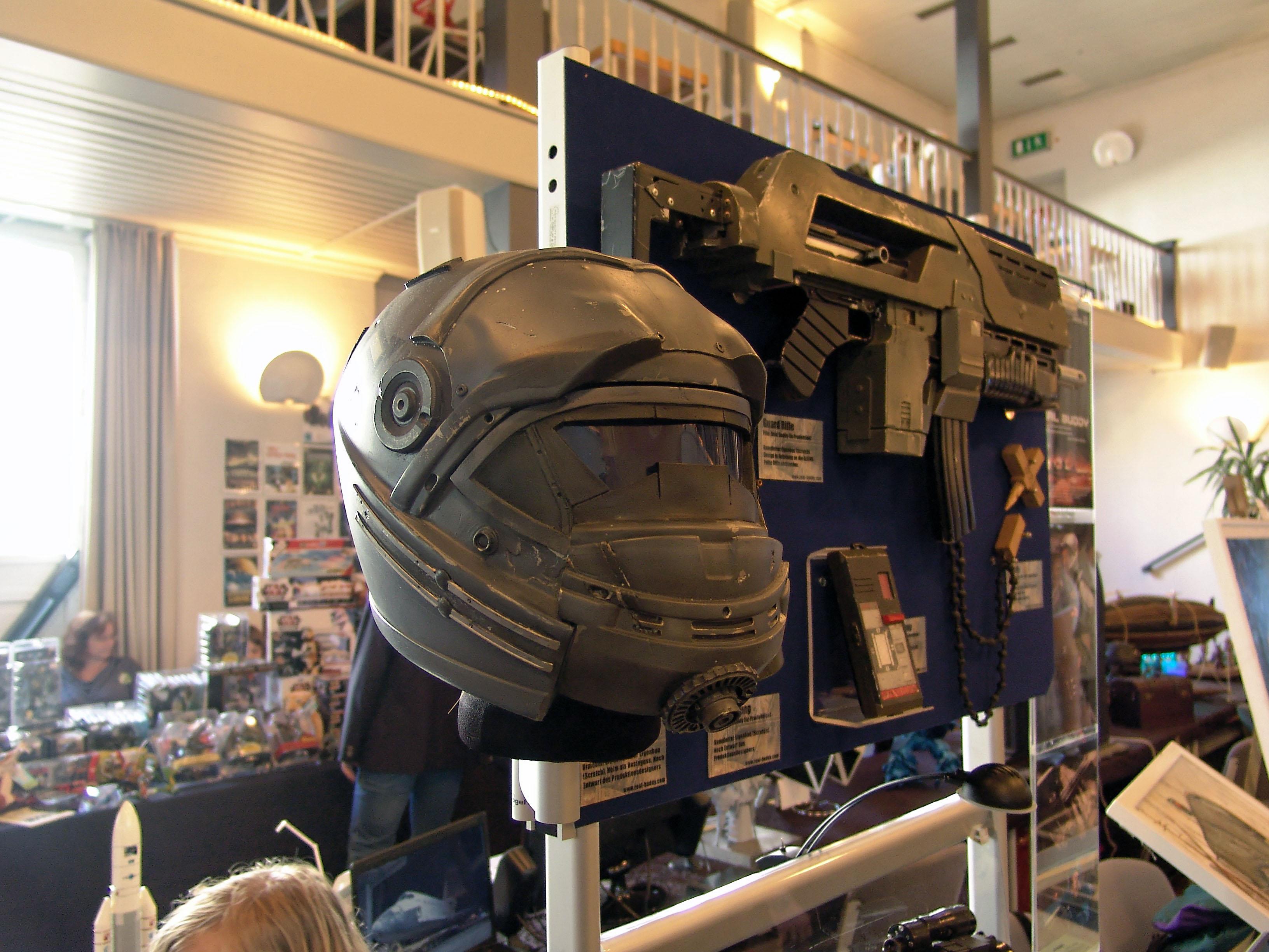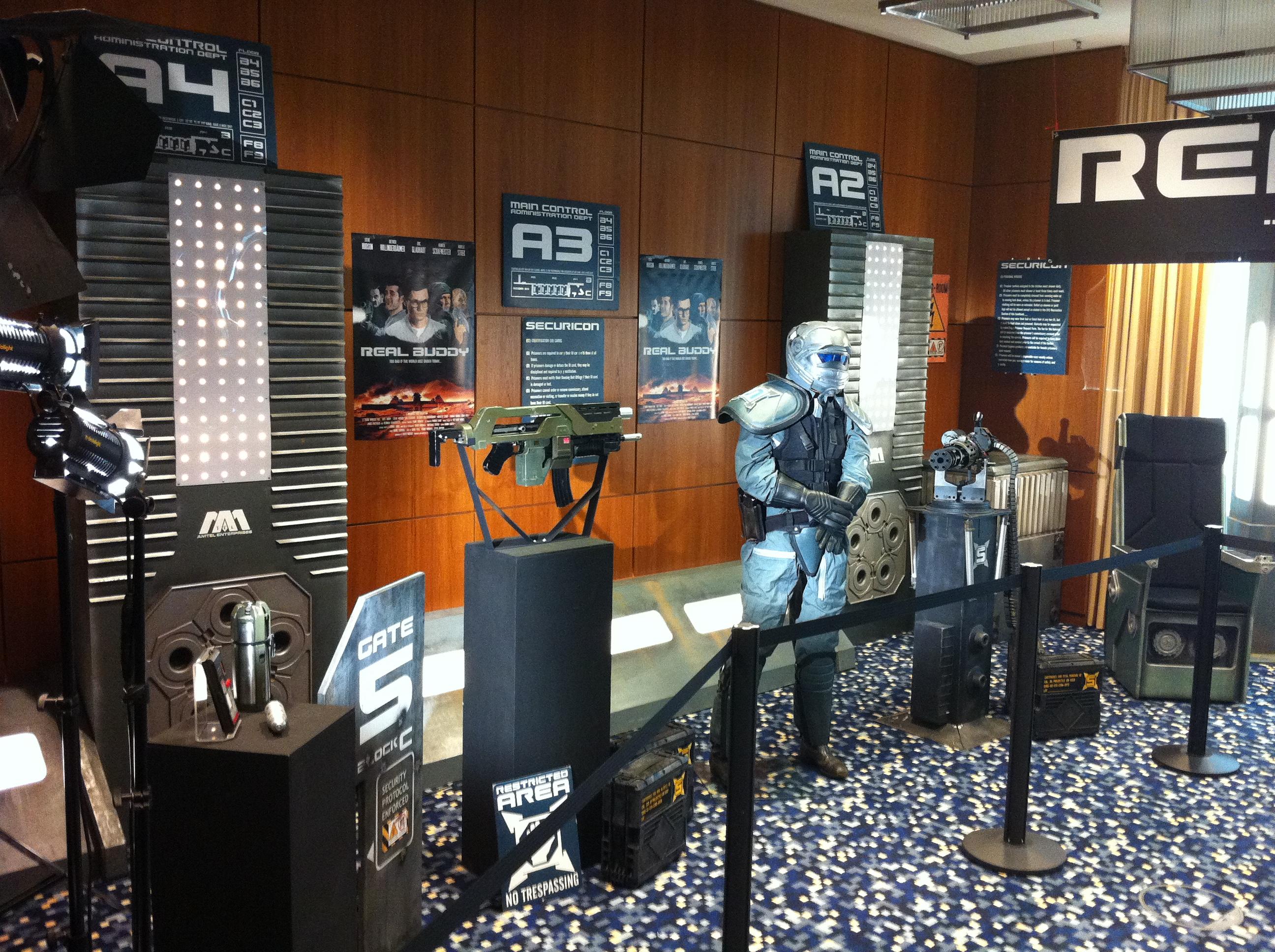 For the first time, we presented original props, set pieces and costumes to a large audience. What better event can one think of than Europe´s biggest SciFi convention ? Thousands of people came to see our exhibition during the four days of FedCon in Düsseldorf, shot videos, took photos and asked questions, the press was present also. REAL BUDDY T-Shirts and posters were sold, people had an exclusive first glance at our 1:6 Securicon guard action figure, soon available in a limited edition from SpaceArt (spaceart.de).