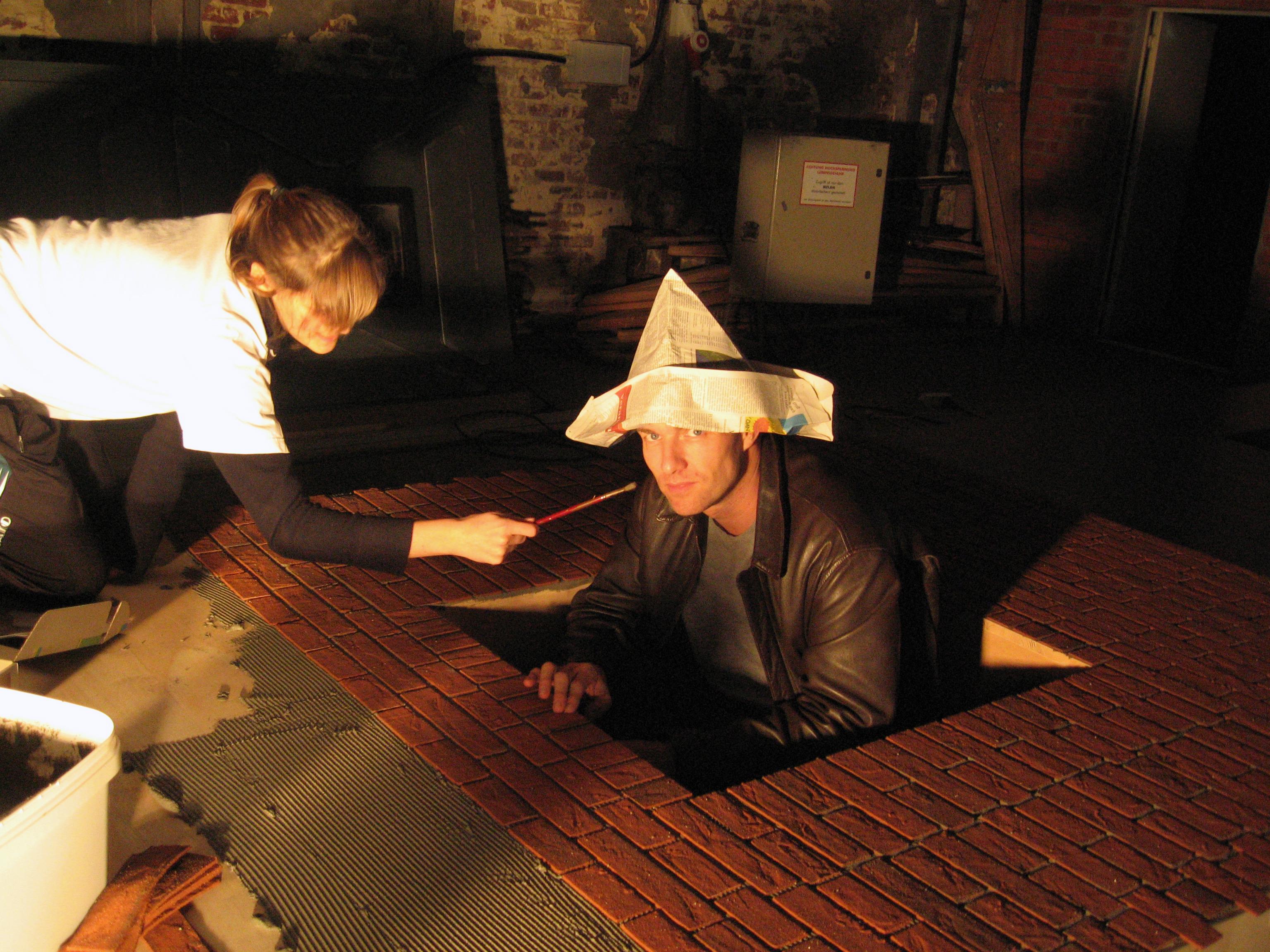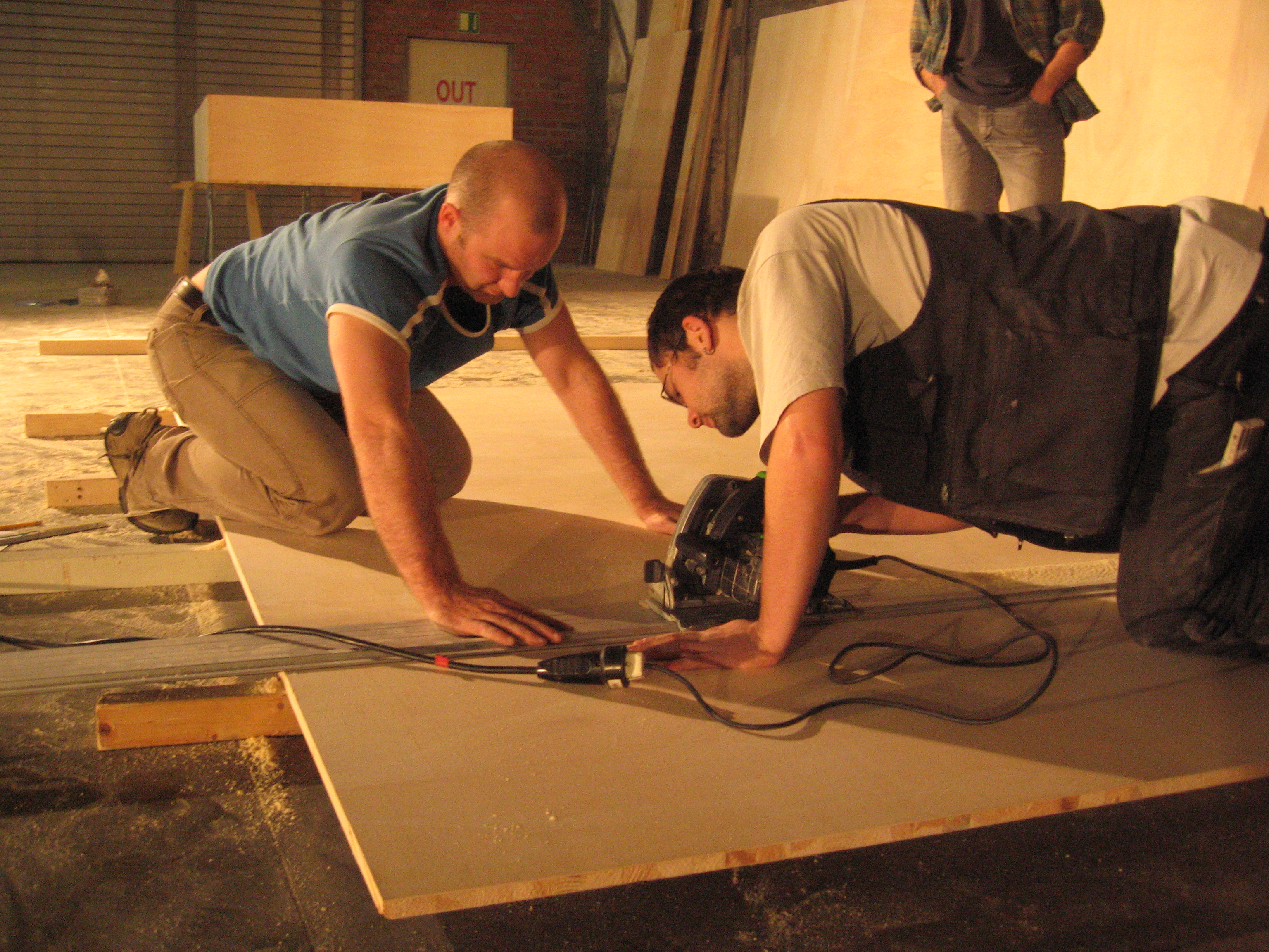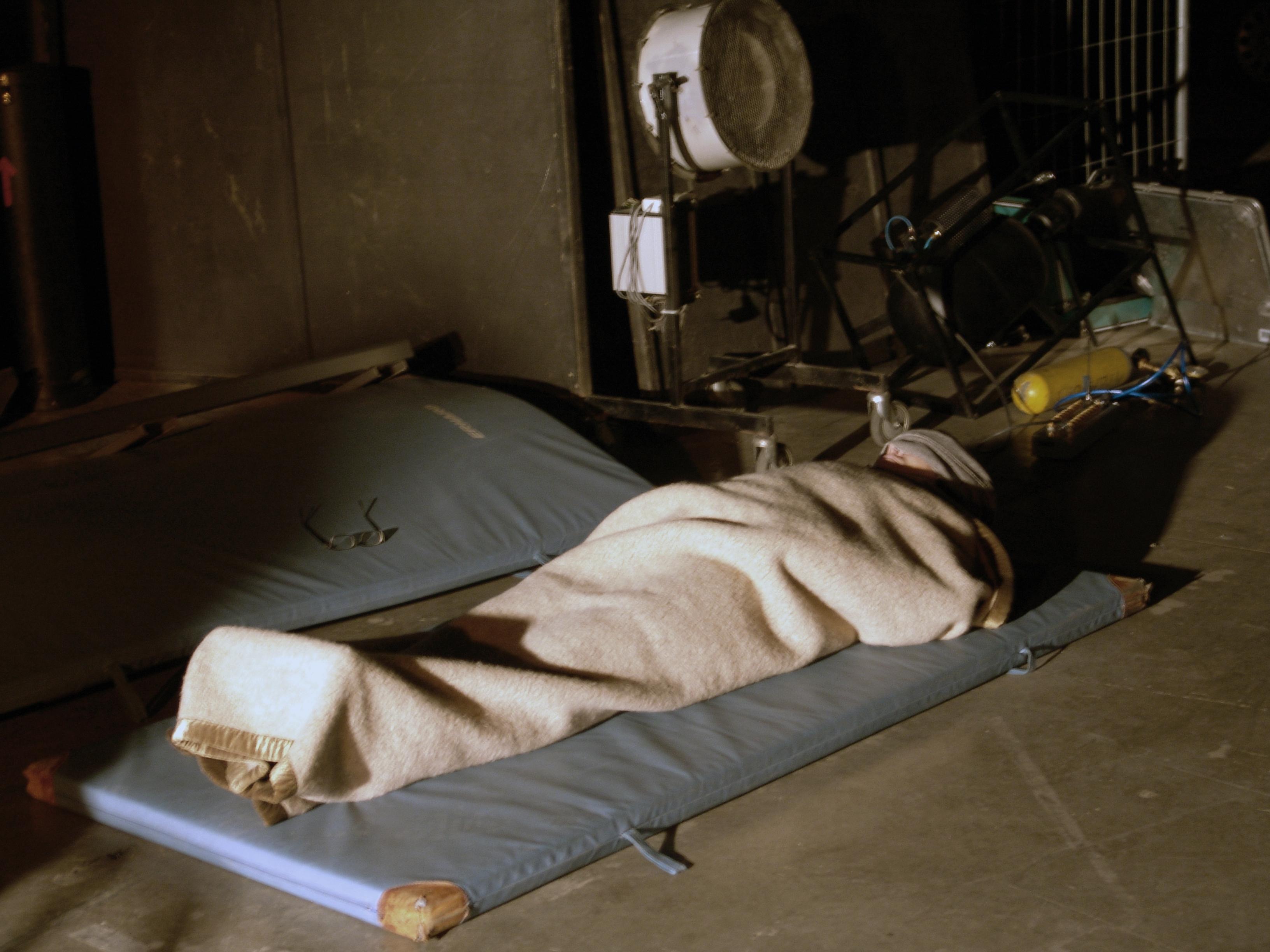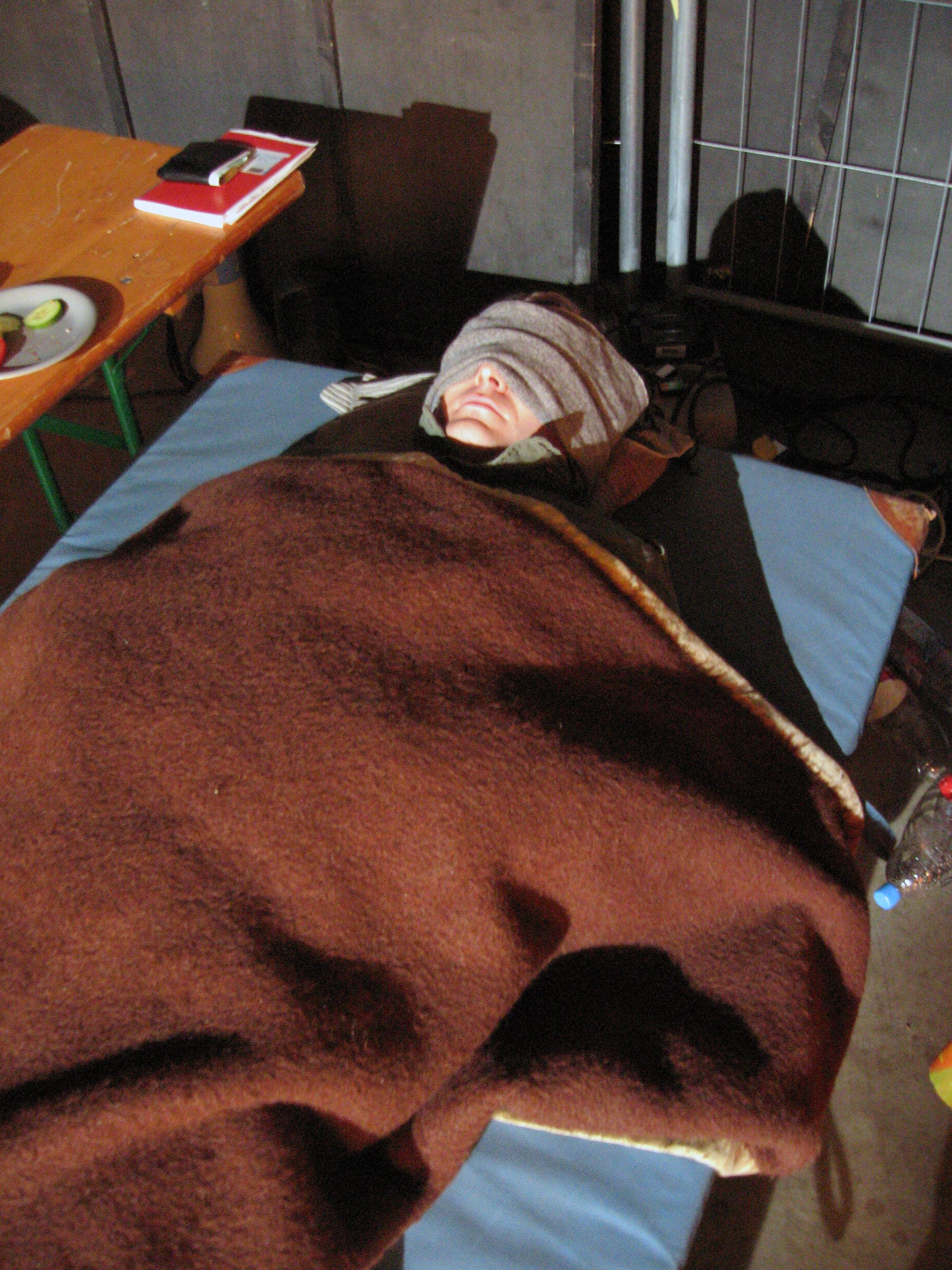 It´s cold here, a big hall, no heating. Between shots, our actors can be found on their chairs, close to a gas heater (we´ve got only one), under heavy blankets, reading some books. The crew members not at work at the moment are fast asleep, on benches, wherever they can. I´m constantly working, so I don´t feel the temperature and tiredness too much. I wonder how on earth they can find sleep here. I would never be able to have a nap under these circumstances. Too much noise and stress around everywhere. I hope we won´t run in into time problems. The hall´s roof has big windows, so we only have a limited timeframe due to daylight coming in in the morning and Dietrich Hollinderbäumer has to leave on time to catch his plane to Vienna. To add to the pressure, we expect the traffic to be audible somewhere at around 5:30 am, which will cause us major sound problems. Oh well, it´s a hall, not a soundstage.