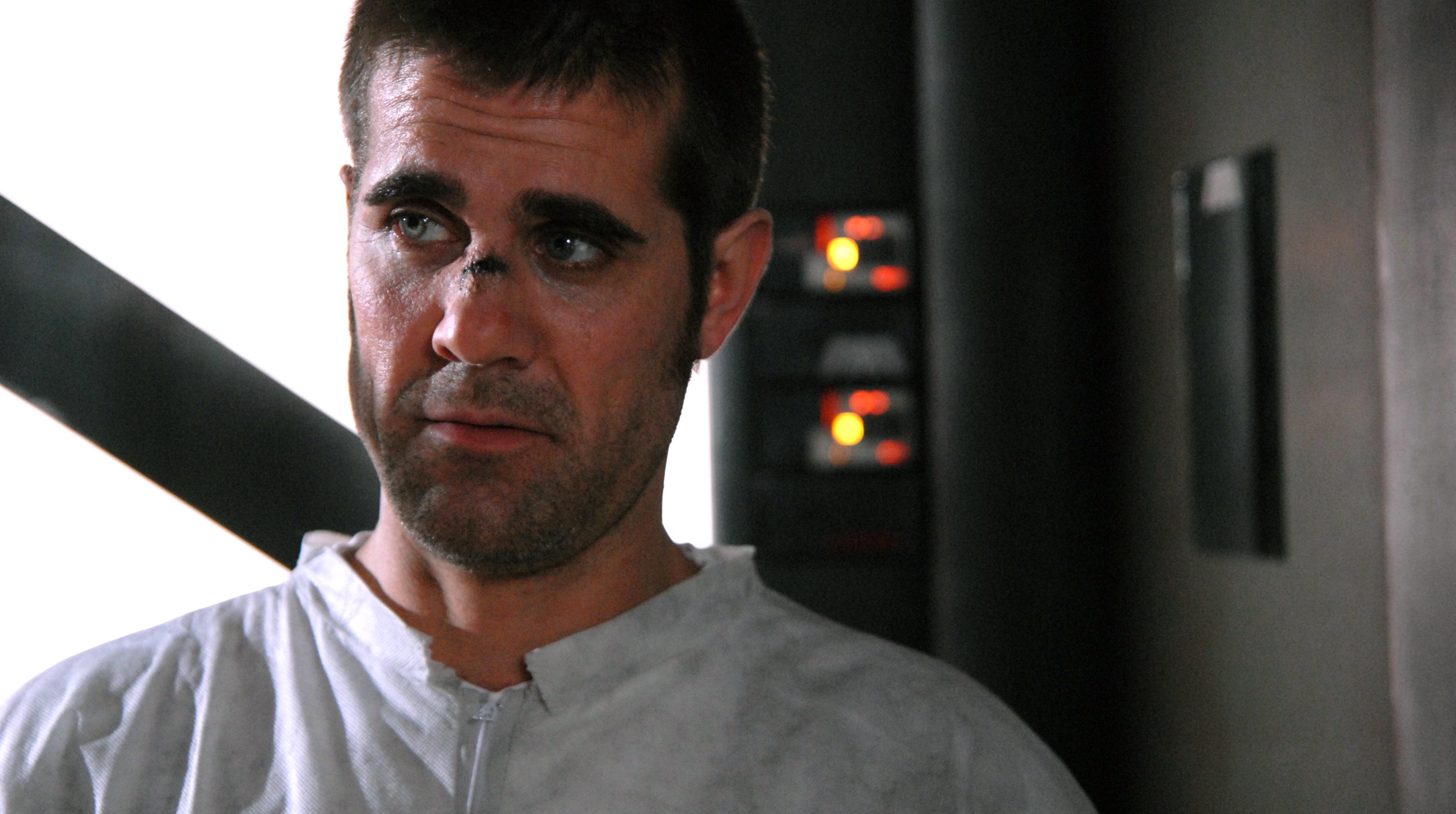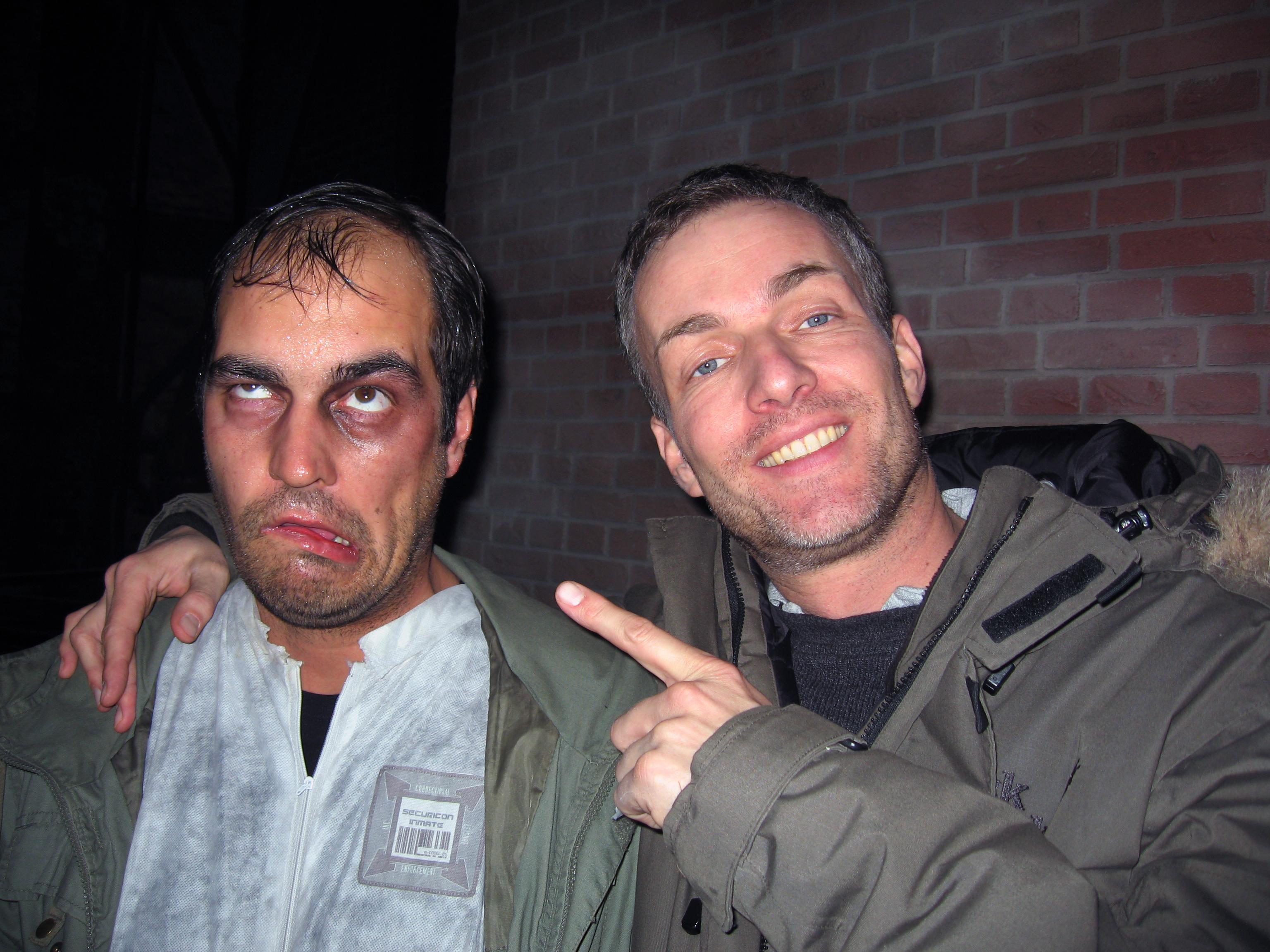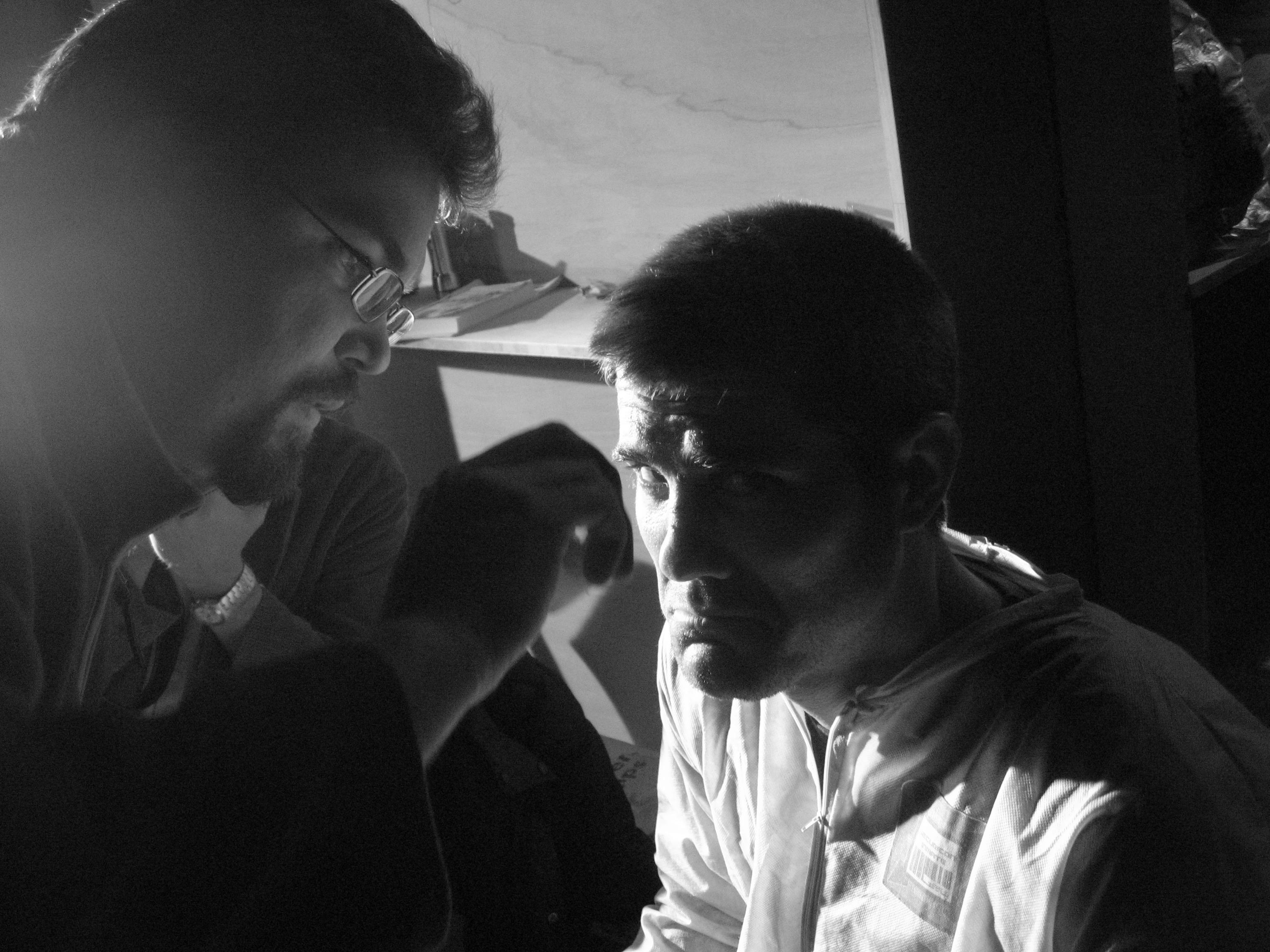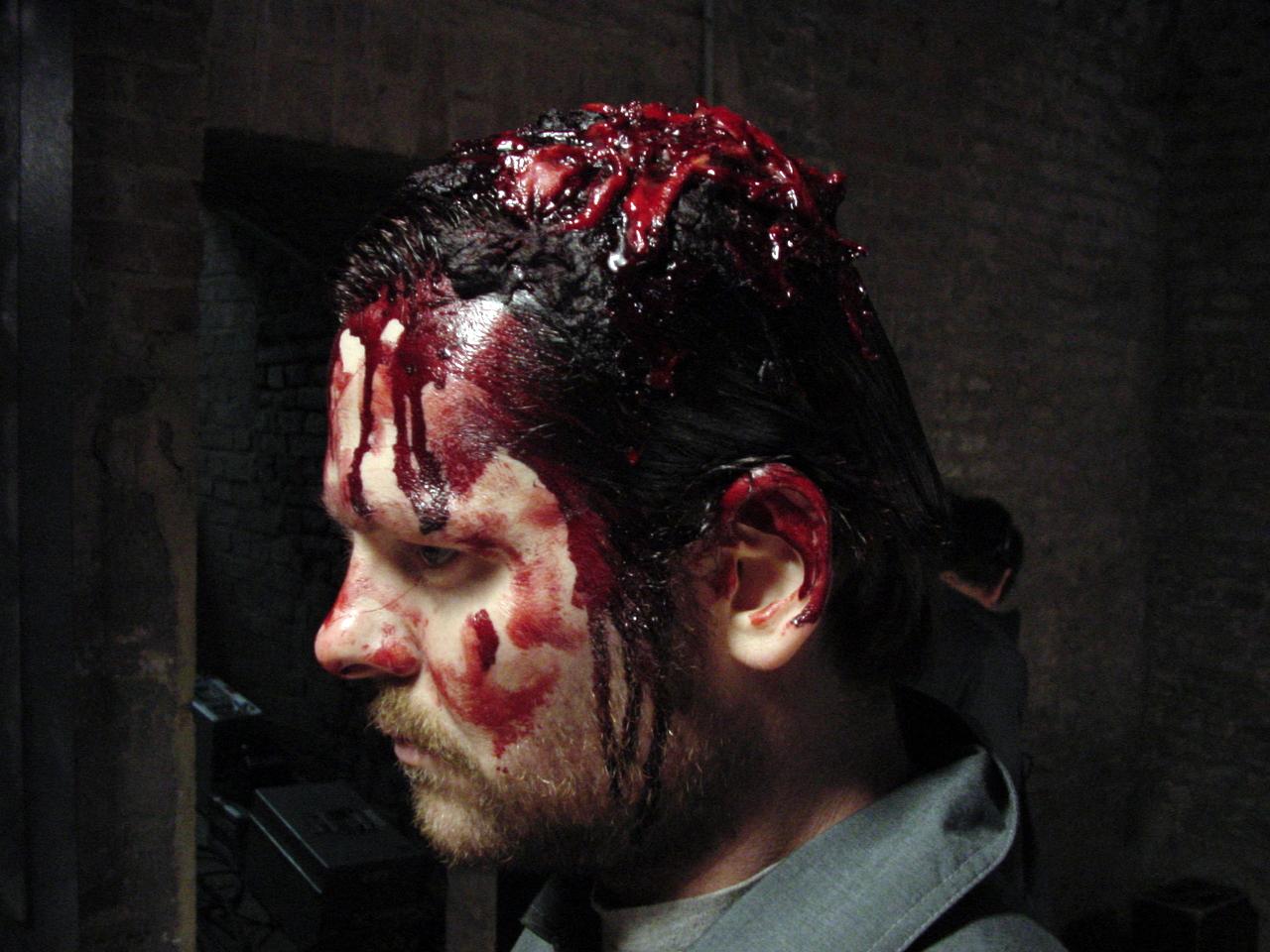 The door opens and Dietrich Hollinderbäumer walks in. He hasn´t changed at all ! I´m relieved. He greets me warmly and applauds me for my recent additions to the script. Not a word about the long pause we had to make since the last shooting phase. Steve and Eric arrive. Steve has gained a little weight, but despite that, he´s very much the same. Eric gets into make up and his hair, long and kind of reddish is cut and dyed black again. After those procedures, he´s our good old Joe again. Wiepke Dankow, our make up artist, adds the bloody scar to Eric´s nose, a detail demanded by continuity Julian Eilmann, and we´re ready to go.