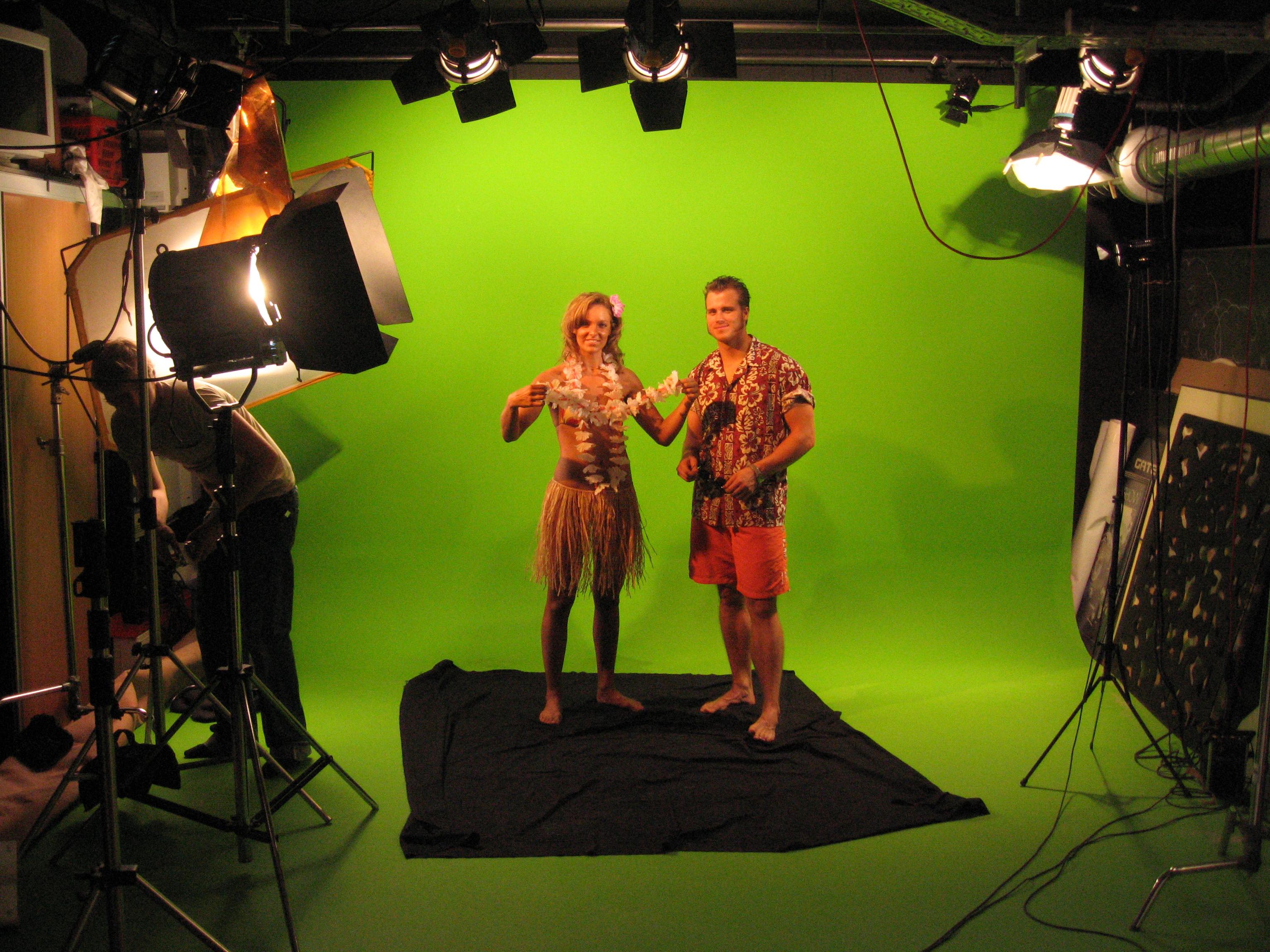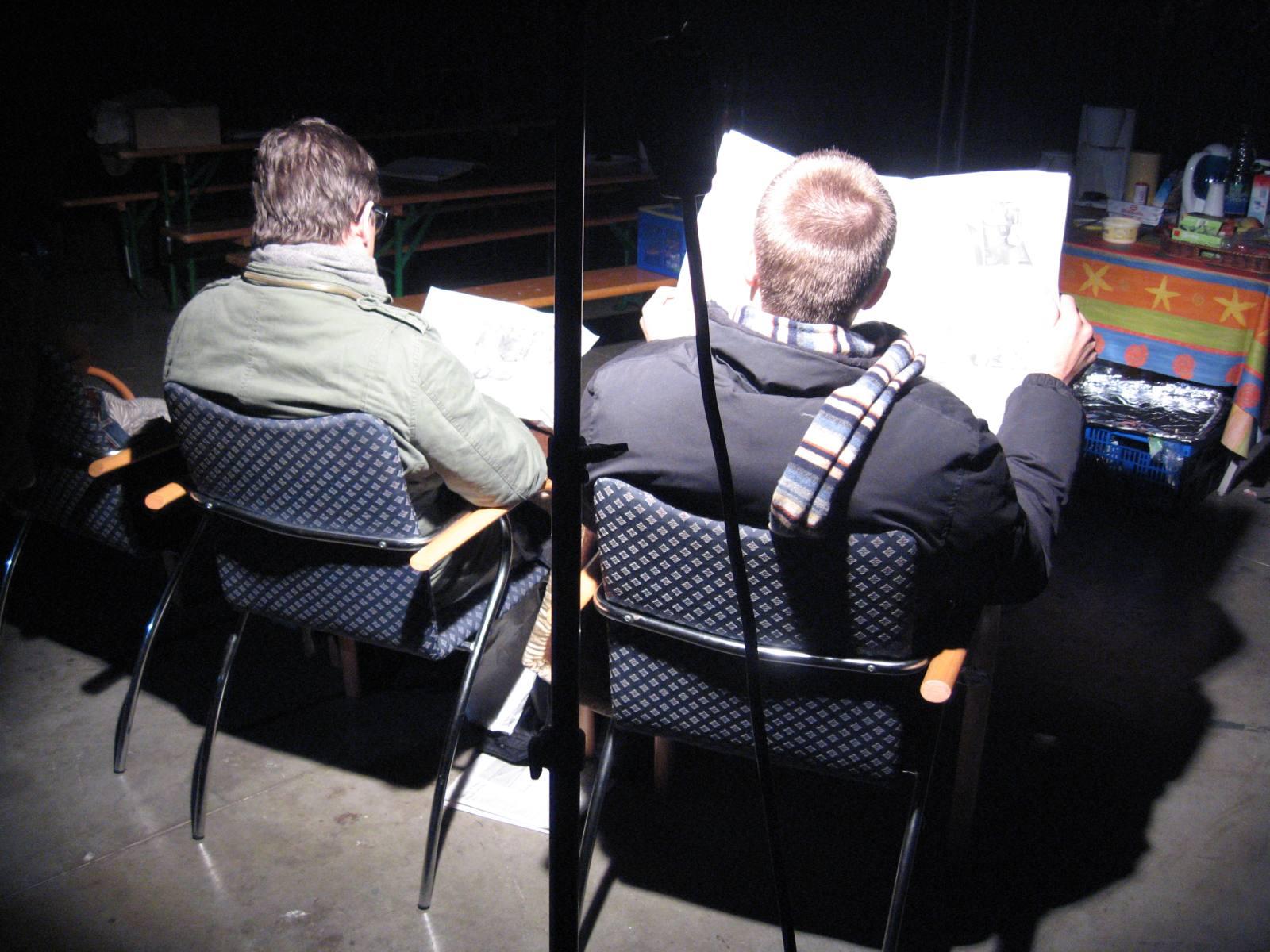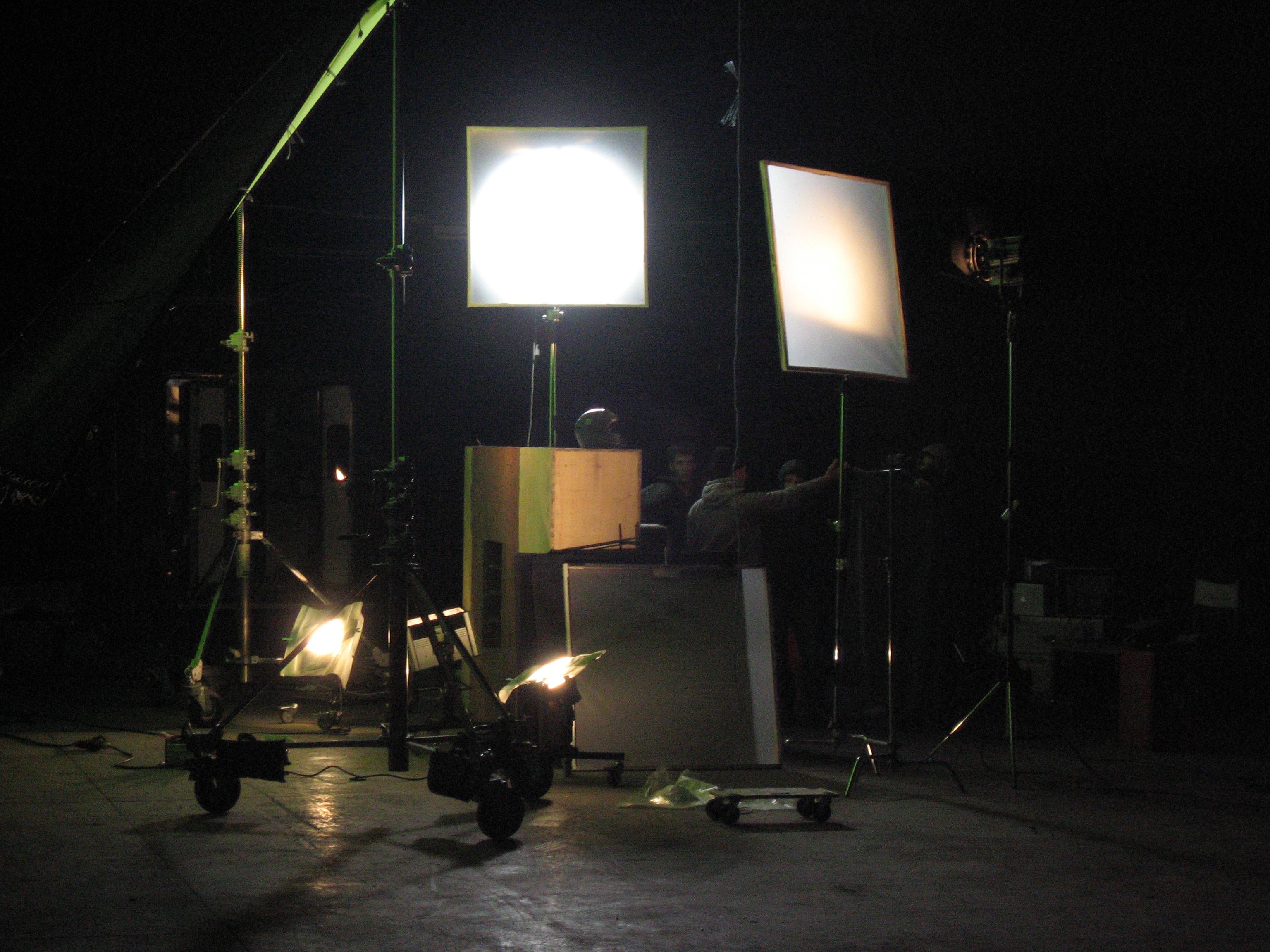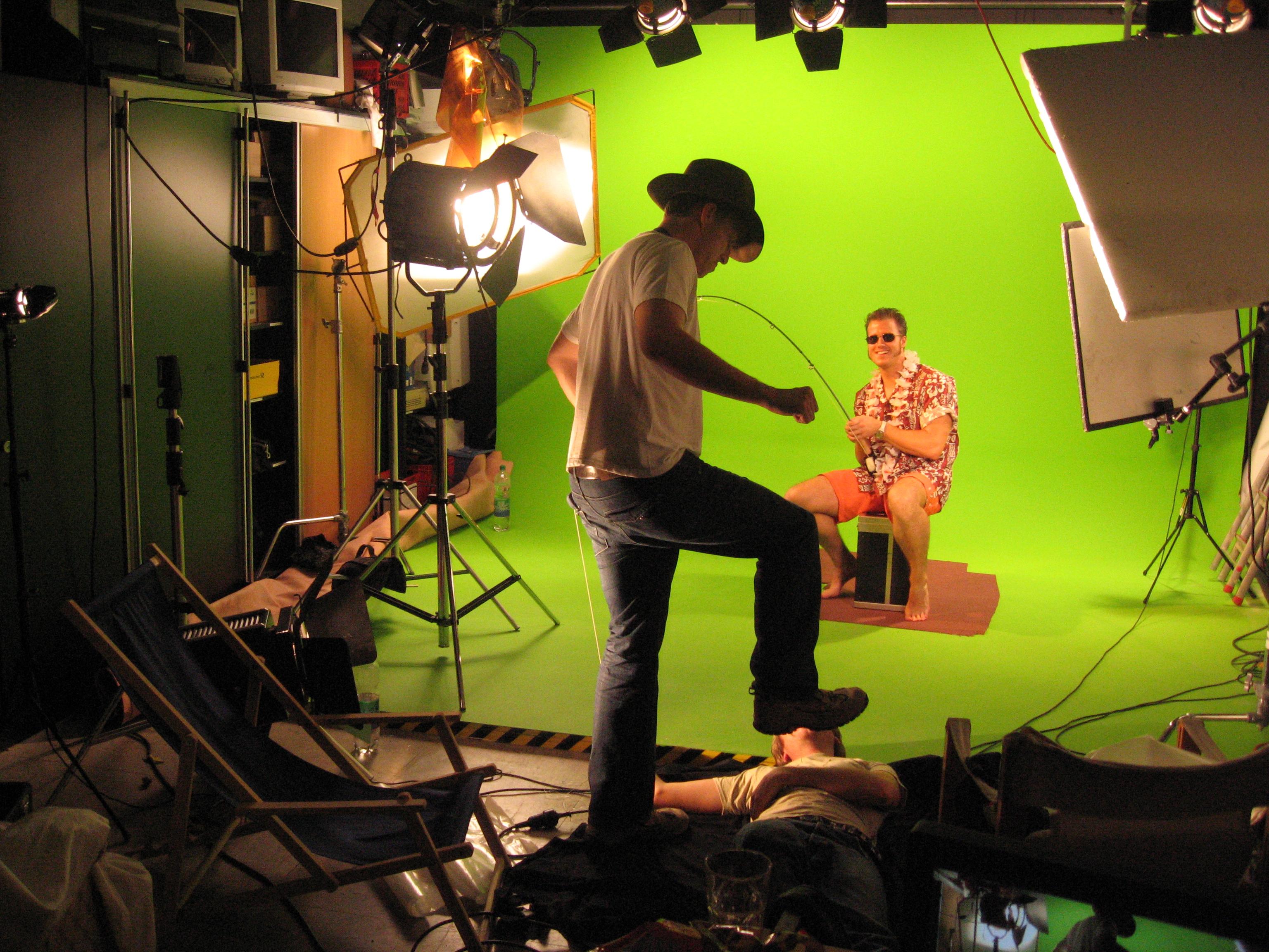 Saturday morning. This is a day of historic proportions ! REAL BUDDY starts shooting again ! No, seriously, this means a lot to all of us. After the long time the future of the project really had to be questioned, we finally start work again ! The first day will be a greenscreen scene in which we create a TV news studio. For that, our construction guys created a fancy looking desk for the actors to sit at and read the news to their audience. Of course, like the whole film, these news will be full of surprises.I create a typical TV studio lighting, to create a credible atmosphere. The scene is supposed to look realistic. To add to that atmosphere, we shoot HDV, because we need a video look for the scenes taking place in the news studio. Later, the green background will be replaced with all kinds of monitors and graphics visually representing what is said in front of the camera. Florian Rohn, our 2 D artist responsible for the creation of the backgrounds, arrives on set to supervise everything, because the actors need to positioned in a way we later are able to see the background graphics. Flo hands out stills from his storyboard to communicate the positions to the crew. I´m excited to start work.