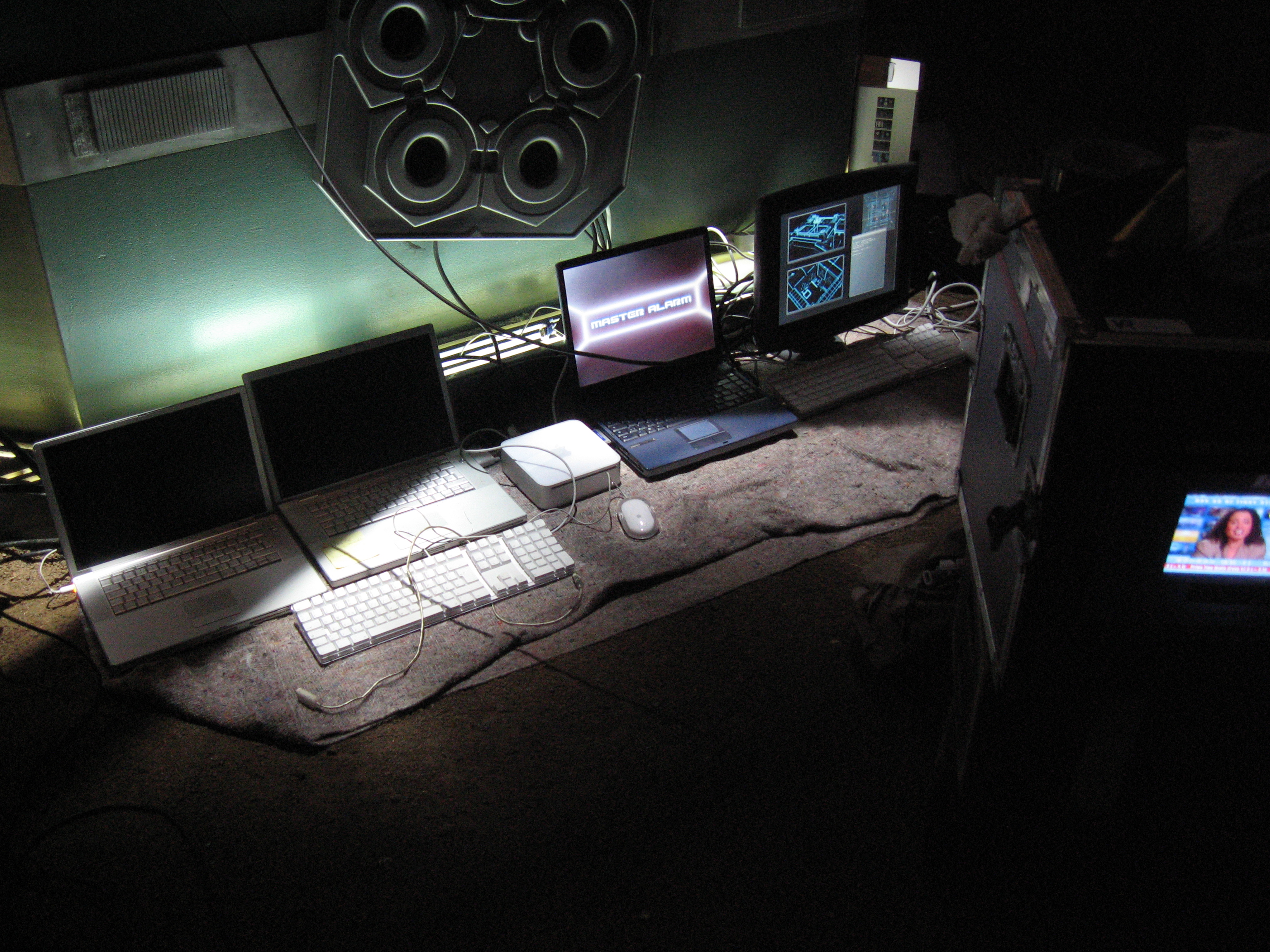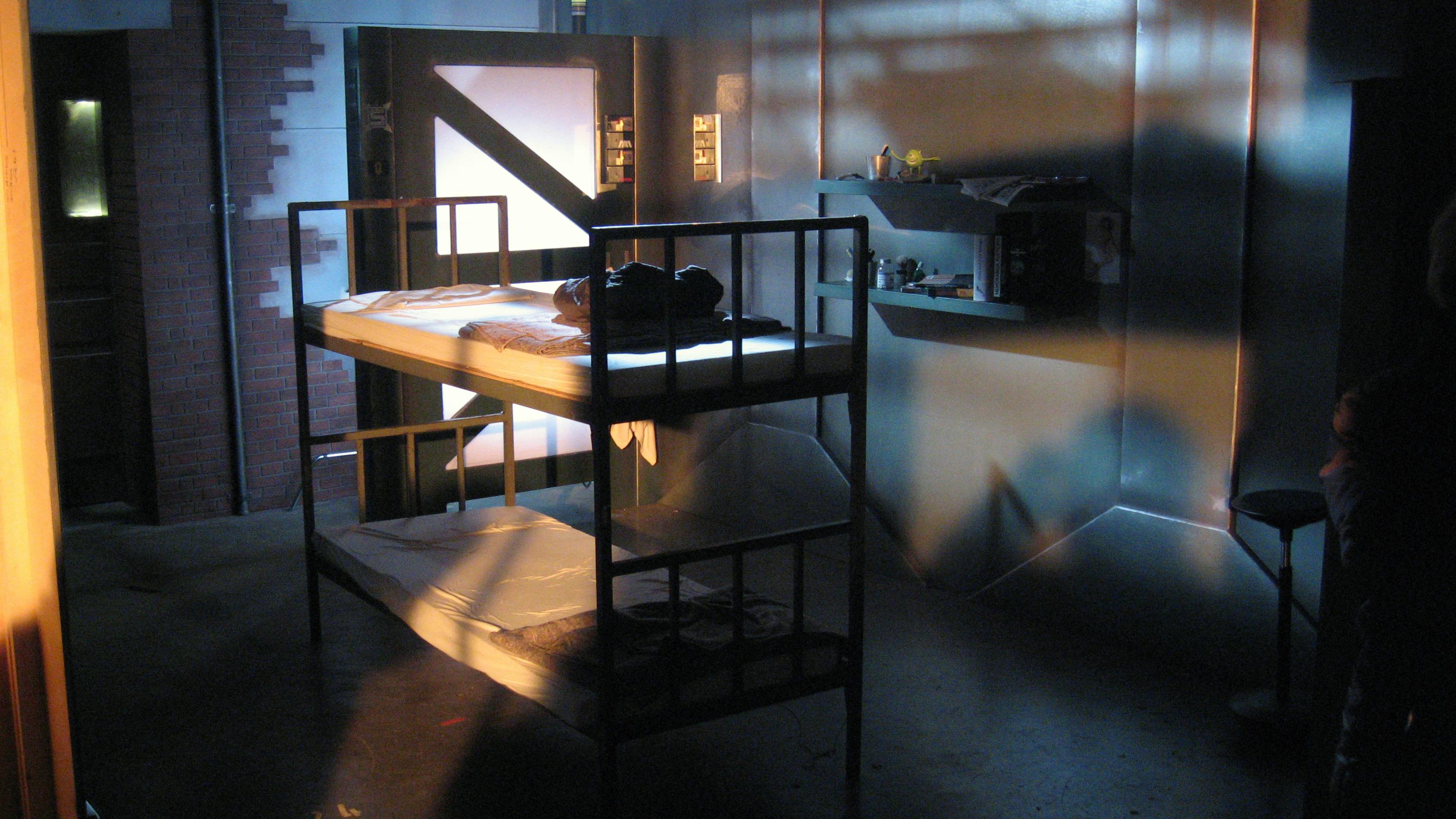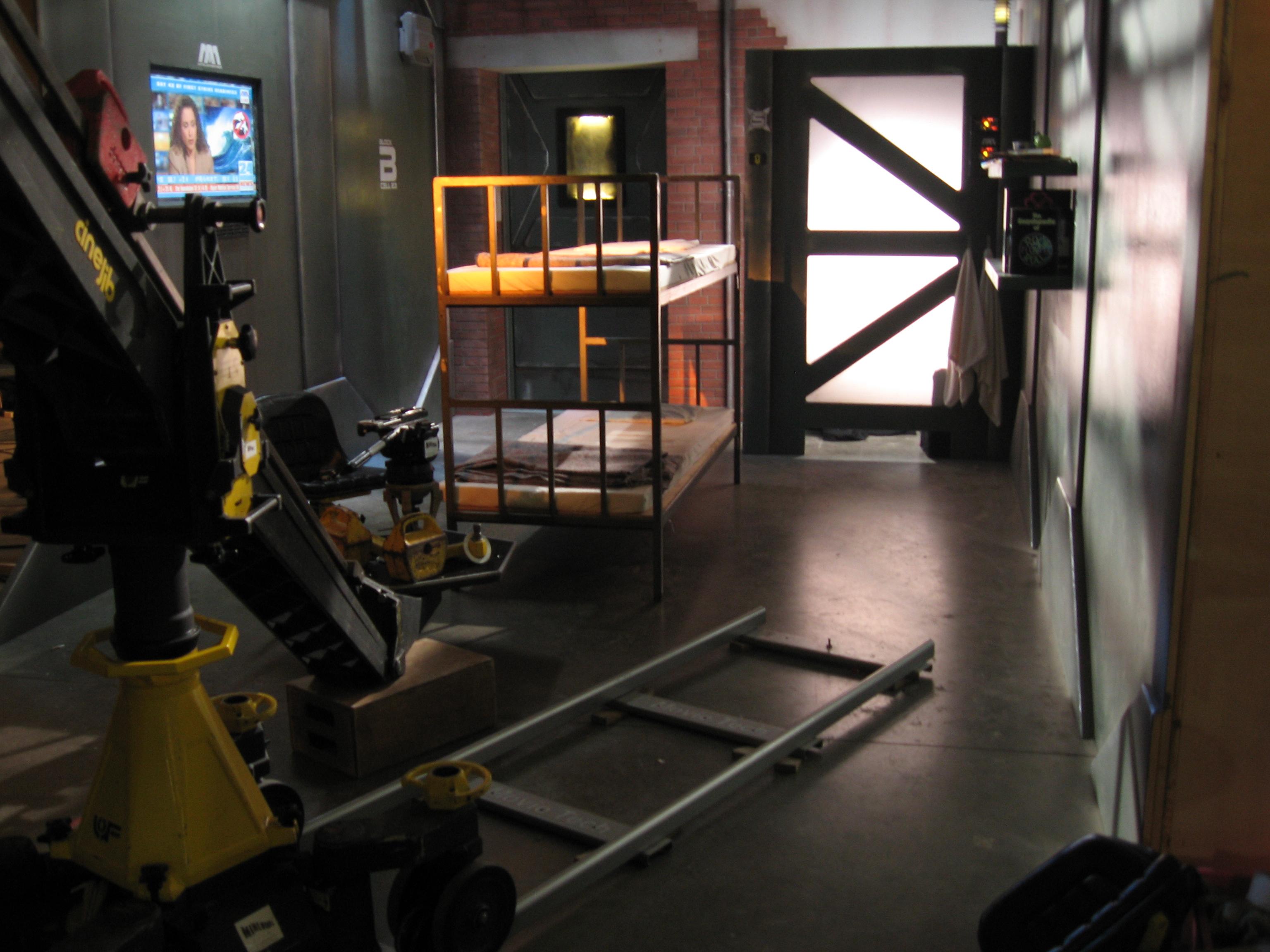 We are preparing a scene with Eric Gladhart and Steve Hudson on their cell´s bunk bed, watching TV. The monitor is a huge 16:9 TFT we put in the cell´s wall. The TFT is connected to a MacBook Pro with Quicktime movies we prepared for playback. For the close ups of the actors watching, Florian Rohn prepared a Quicktime with flashing colors and back and white parts, continuously changing. We figured our regular “program” was just not intense enough light wise to create the necessary effect in their faces. It works beautifully.