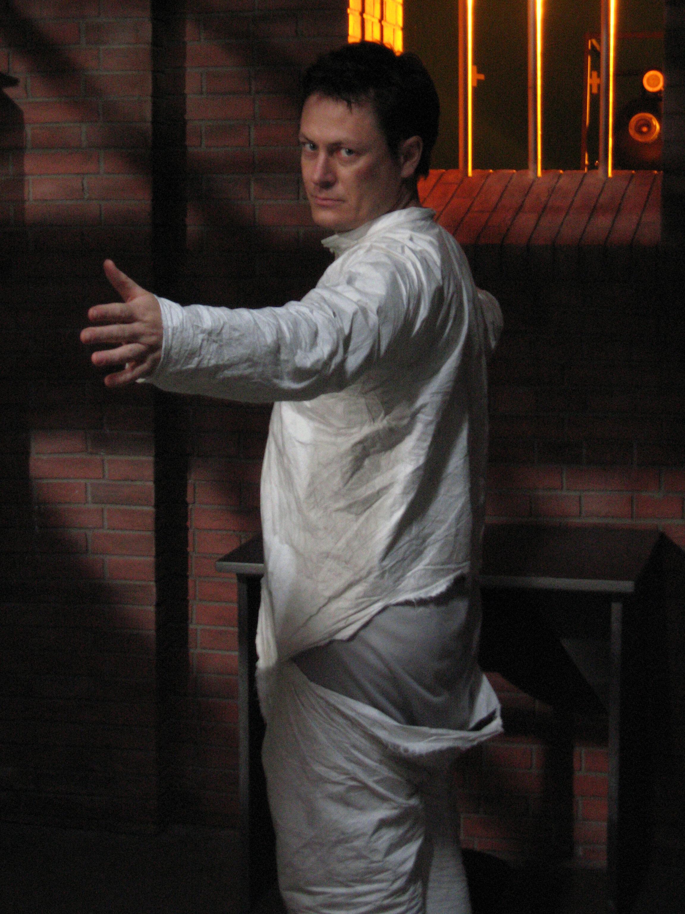 Shooting has begun ! We have to hurry. Dietrich is only able to join us for this one night, because he has to return to Vienna, where he´s in a stage play for the next couple of weeks. This left us with a very tight schedule for today. Again, like in phase I, we have to start with the most complicated scenes at our first day of shooting. Damn ! First take is a dolly move on Didi, entering the cell through the heavy steel door which opens with a hiss, caused by Dennis steam system. All has to be timed exactly and we have to do several takes just to have that effect exactly where we want it to be. Didi has problems with some lines. It´s still our warm up, no doubt.