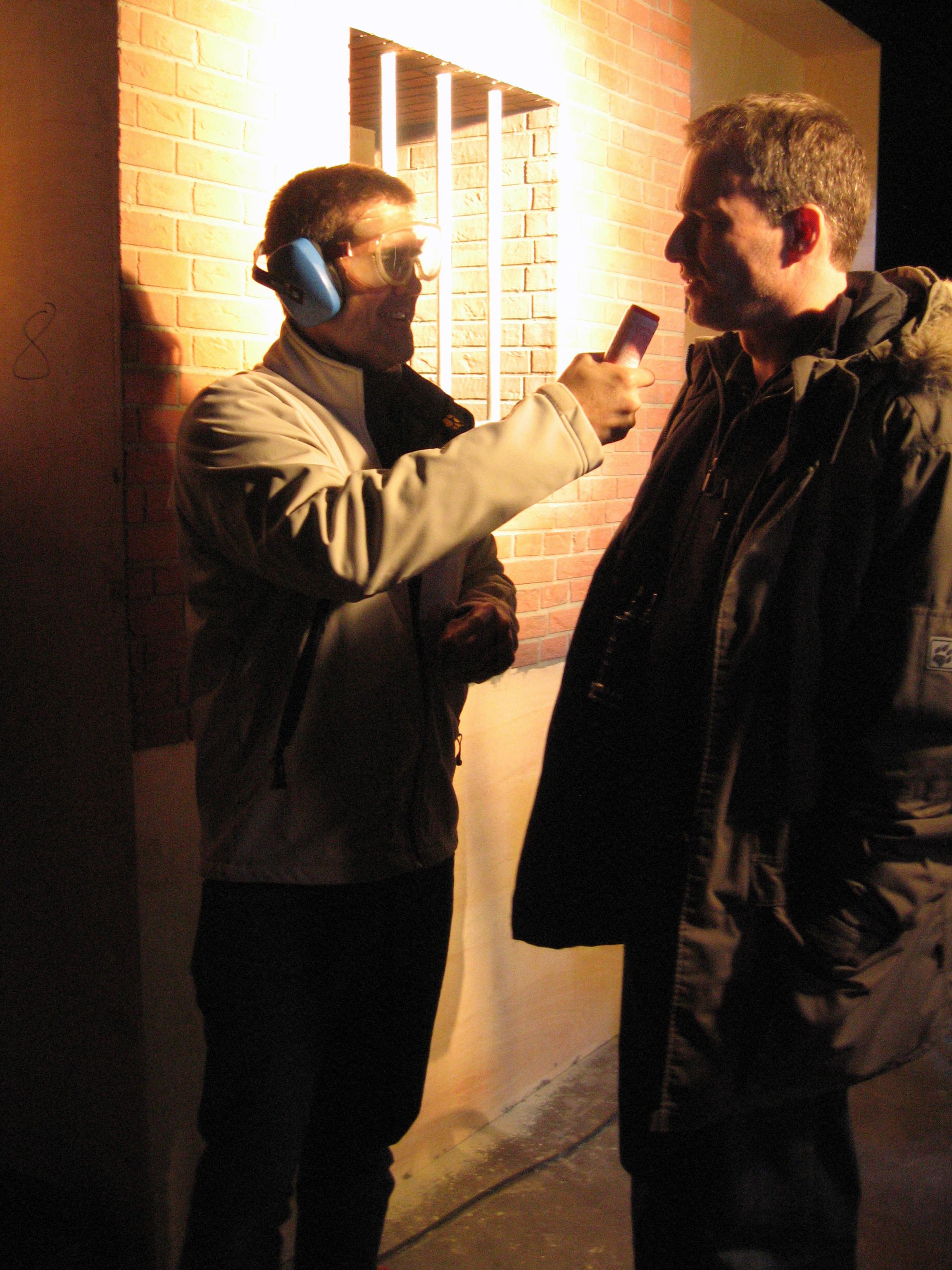 It´s getting damn cold ! When people speak, little steam clouds emit from their mouths already ! I hope this can´t be seen in the shots. Wouldn´t fit exactly to the fact we´re supposed to be somewhere in a desert in this film. Mark Warnecke approaches me with my lightmeter in his hands. Someone put it on a shelf, next to a coffe mug. Of course the next person sitting there managed to get the coffee all over the light meter ! So much for no food on set ! Dennis Kron tries to get it dry with compressed air…