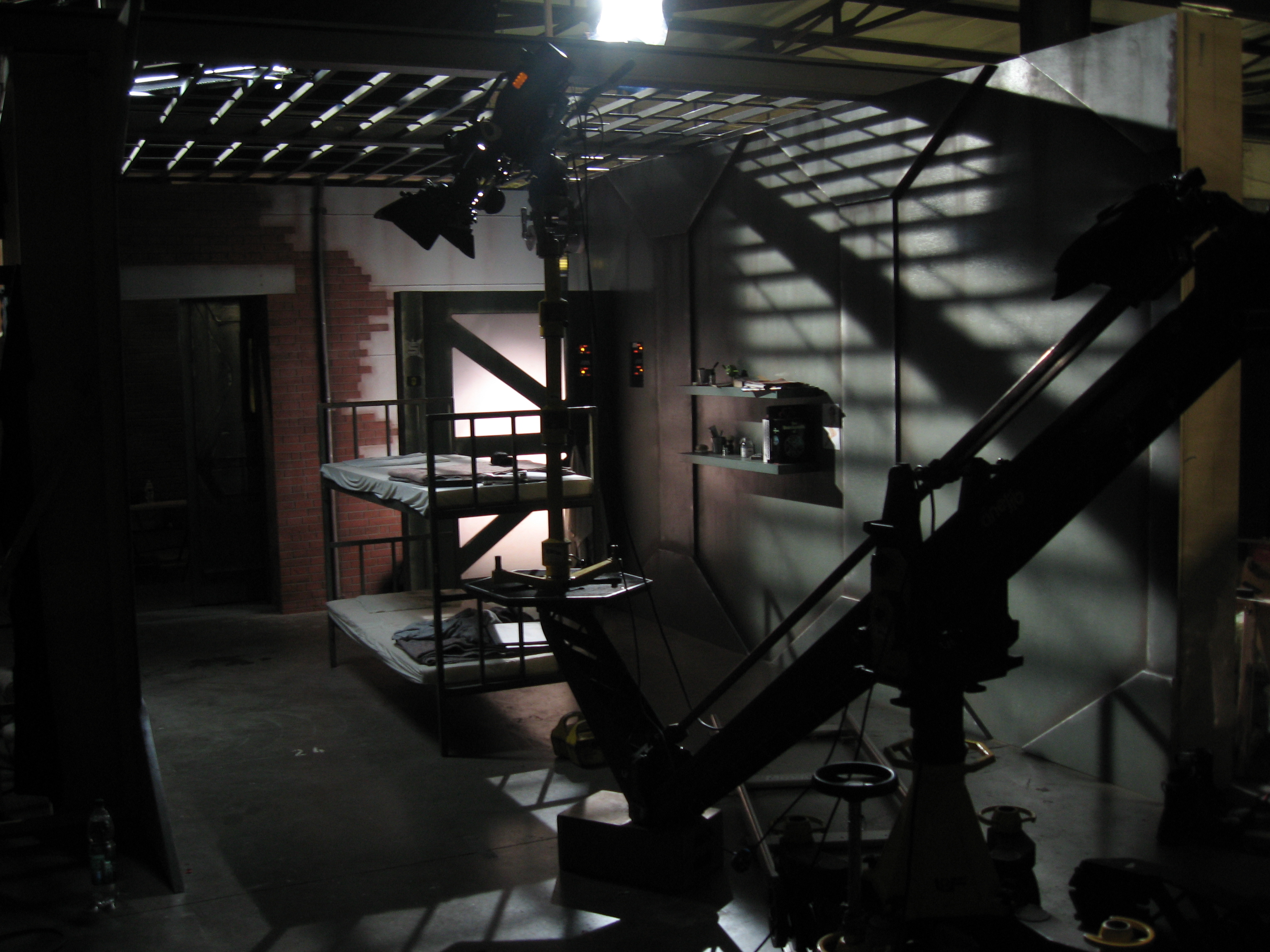 The final shot for this night. It´s the opening shot for the cell. I figured that one out months before and now we´re doing it as the last major shot for the whole production phase. It´s a complicated crane move from a shelf on the wall, over some props, then on the toilet wall, from behind the bunk bed to Joe in front of the TV, all in one take. Then, at the end of the shot, Steve has to come out of the toilet, talking to Eric. For a change, we do a complicated setup at a shoots end. Wow !