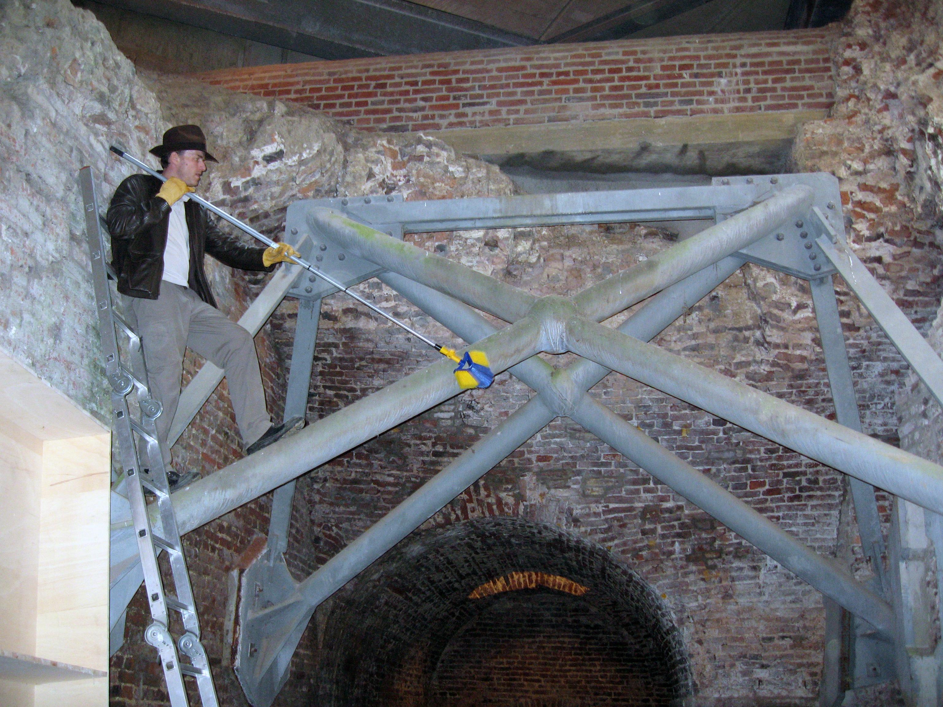 The day starts with a crane shot on the outside cell window. Hanno Gerken, who also acts as our key grip, is setting up the equipment. This is going to be tricky for focus again cause we´re moving in on Steve Hudson at the cell window, looking out. We end in a close up of him, pulling at the steel bars of the window. We rehearse a lot of time before the first clapper. As expected, either the framing or the move or the focus cause problems. Again the problem of wood acting as stone or steel. Anytime Steve pulls, the bars make some noises which do not fit into our idea of steelbars. So Steve has to bring in his experience from the cell door and treat the bars very gently while making it look as he would pull very hard. Well, film is illusion, right ?