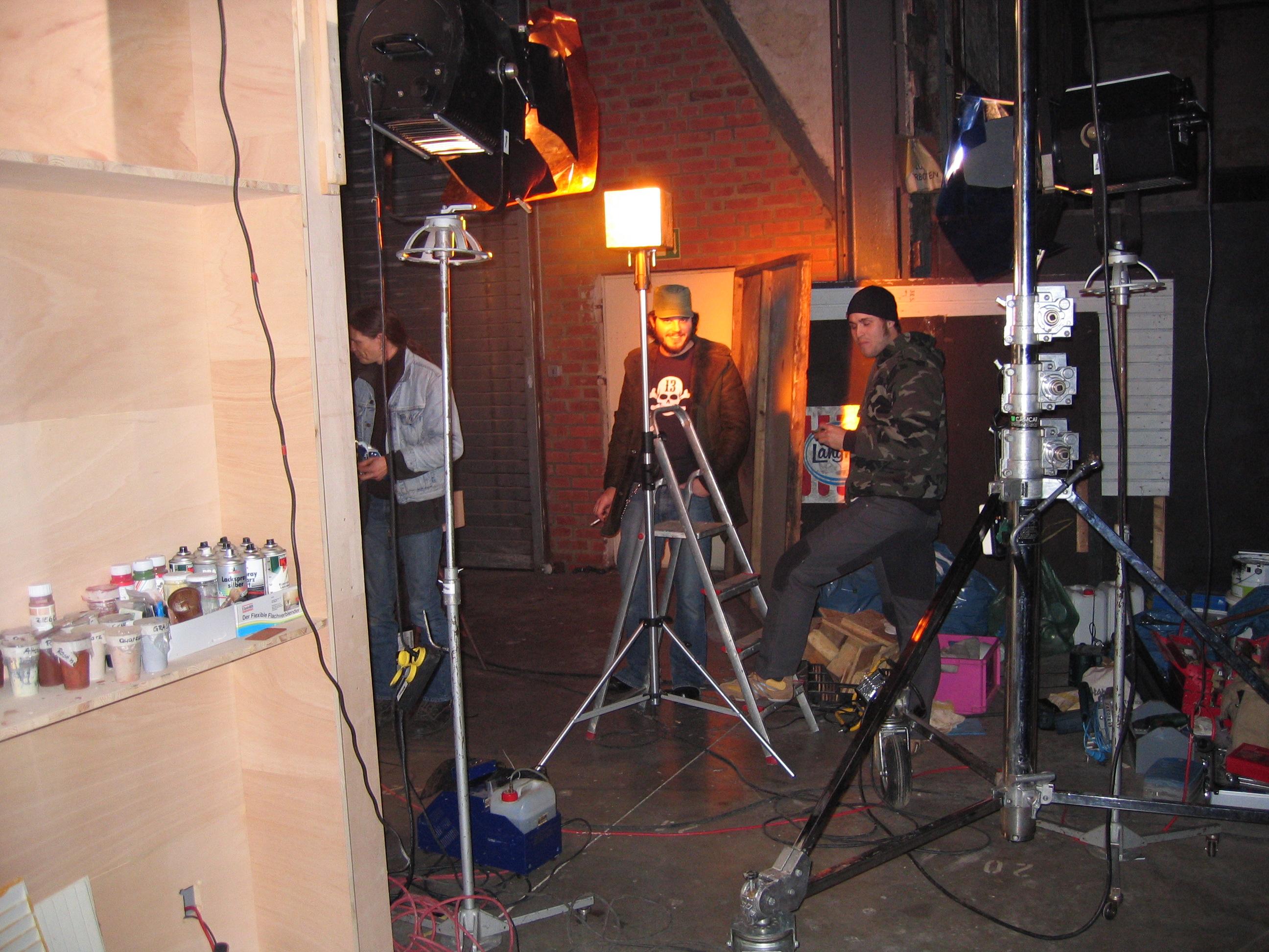 We rehearse carefully. The shot has to be timed exactly. Mark is a the dimmers for two 2K Arri´s while Dennis operates the air blast and a wind machine at the same time. We plan to start with the wind, then the lights get brighter and brighter, the the wind increases and then the blast goes off, hitting the window with it´s frame full of Dennis´dust. I want this to be seen from 4 different camera angles. Jens Fischer, the 1st AC, mounts the camera on top of the set, looking down on Steve for the first camera position. Then it´s time to shoot. 1,2,3 BANG ! Steve goes flying, into a mat we prepared for him off frame. We all gather around the HD field monitor and playback the shot. It looks fantastic, especially in slow motion.