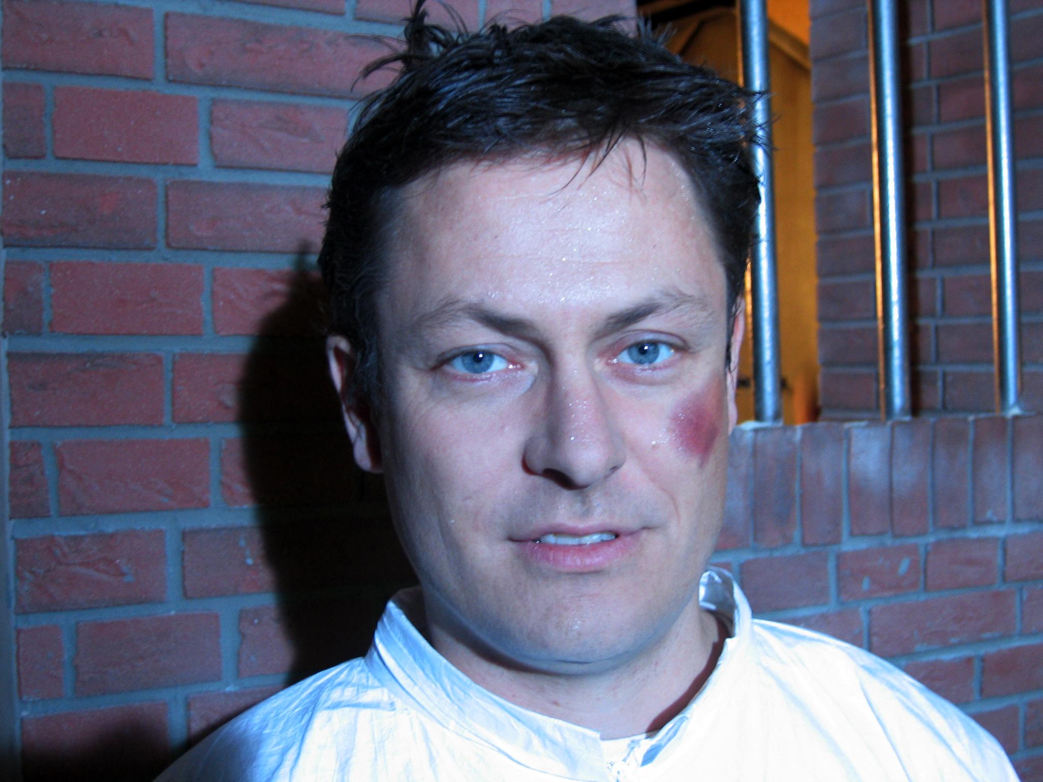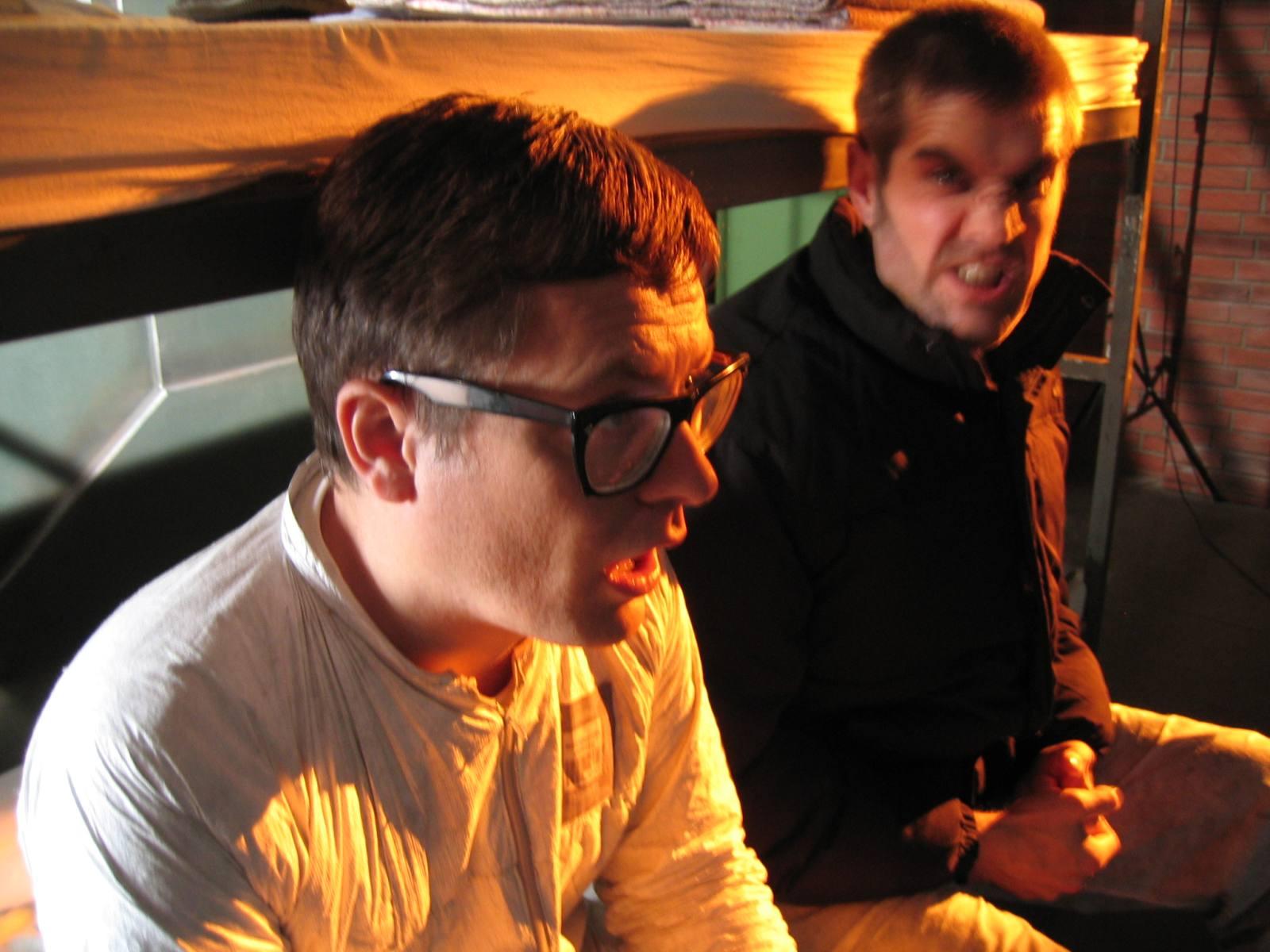 Almost done for today. The take left is Steve Hudson running around in the cell hysterically. I ask him to hammer his fists against the steel door of the cell. This proves to be tricky for the sound. Christian Weidner, our sound recordist, complains about the fact that each knock on the door sounds pretty much like knocking on wood. Well, it is wood painted to look like steel. Now the challenge for Steve would be to go nuts while maintaining control over his fists only gently touching the door. I reckon that´s not exactly Steve´s way of method acting, but I can´t help. The rest has to be saved in the sound mixing stage.