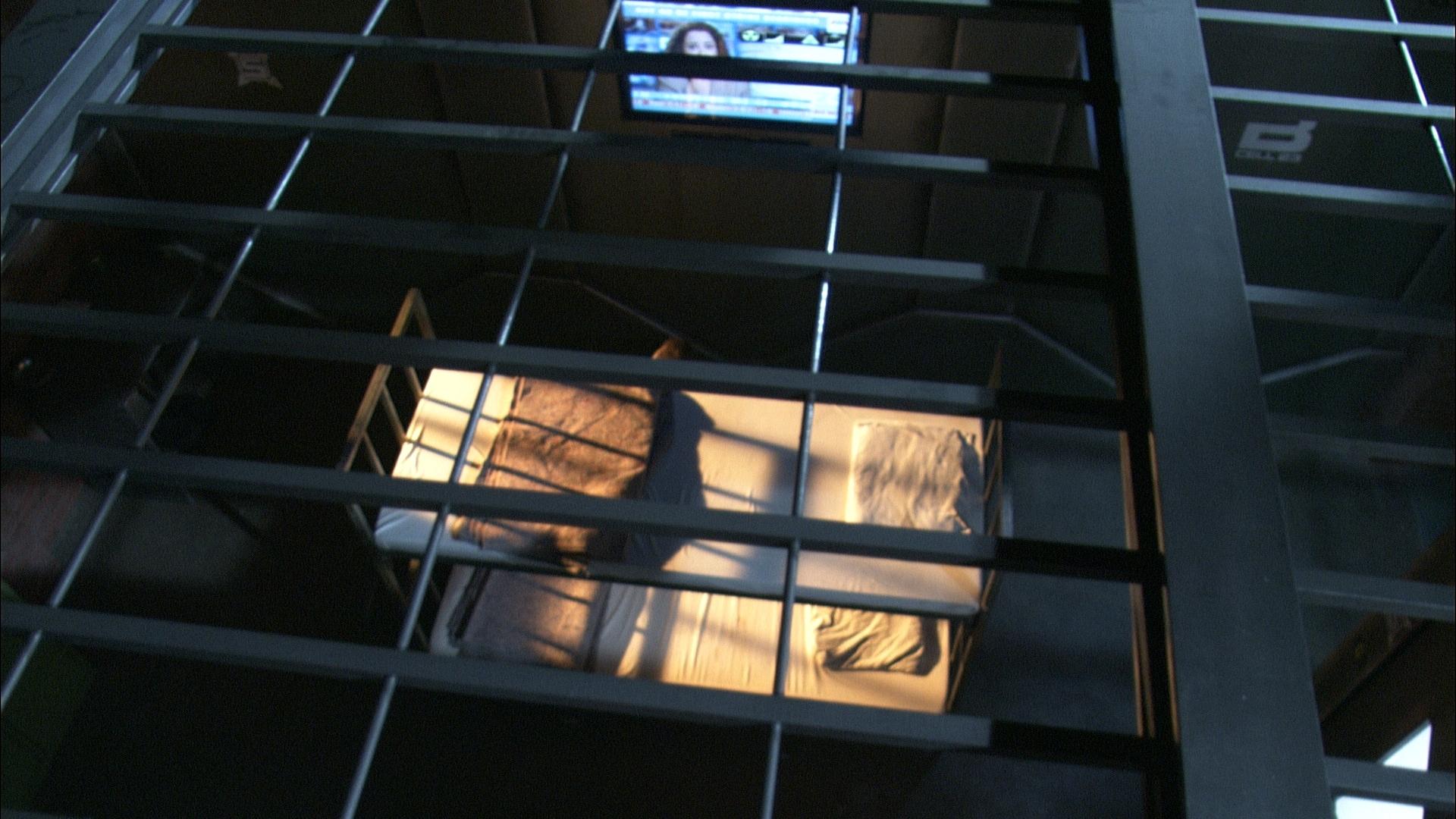 Our last day with actors Eric Gladhart and Steve Hudson. After today´s shots, they are finished with the movie. Somehow, I can´t believe it. Today, we have a bunch of crane shots we left over from all the scenes we´ve done during the week. We start with a master shot on Eric from above the cell´s grid ceiling. Our crane has to be outfitted with all the bazookas we have at hand to reach the necessary height. I climb the crane and Hanno Gerken, our key grip, moves me higher and higher. Due to the many bazookas, I have to stand on my toes to operate the camera, but it looks great. It´s a slow movement over the grid, while Eric sits in front of the TFT screen, watching. The tricky thing here is to end the crane movement exactly at a point the camera can see Eric and the TV and no steel bar from the grid in the middle of the frame. Hanno watches the framing down there on the monitor, but we end up with about 10 takes nonetheless.